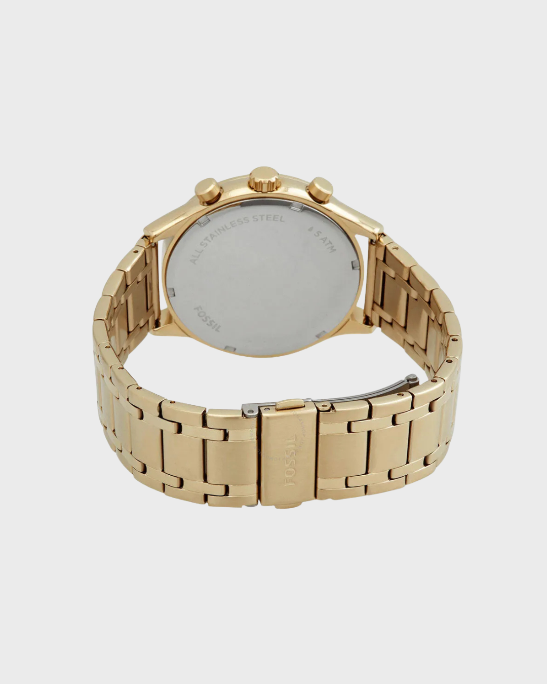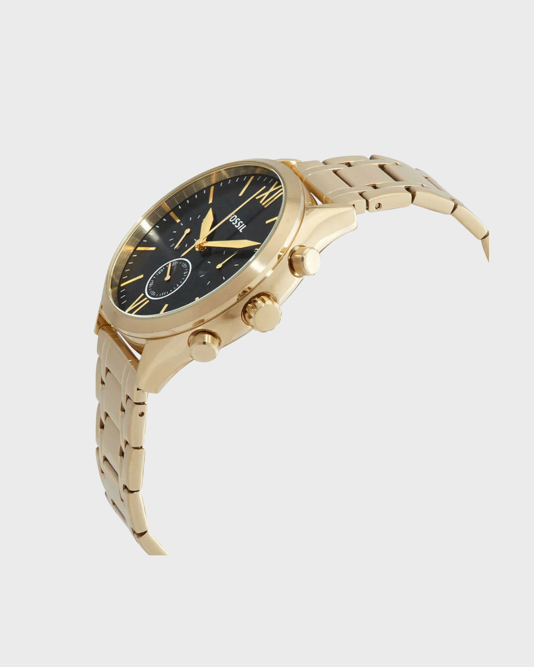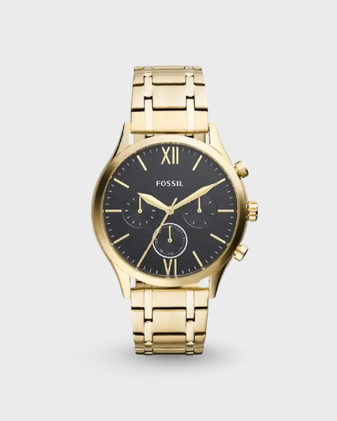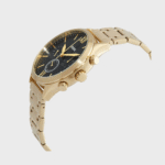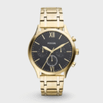 This 44mm Fenmore features a black satin dial with Roman numerals at the 6- and 12-hour markers, multifunction movement and a gold-tone stainless steel bracelet.