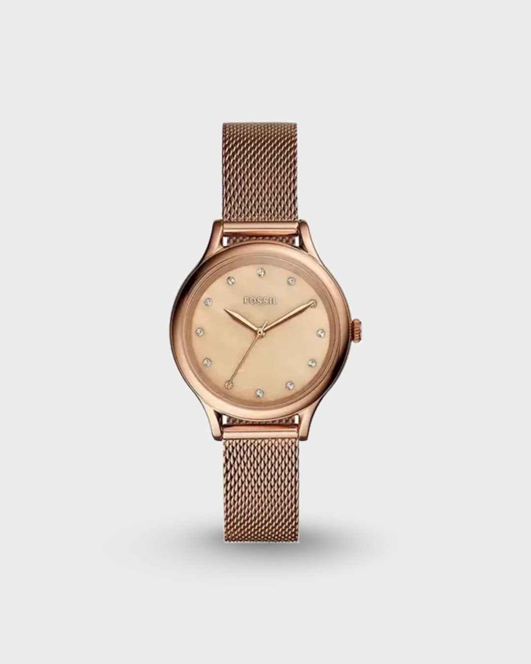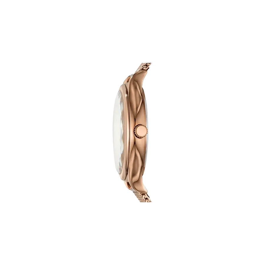 This 34 mm Laney features a mother-of-pearl dial with faceted crystal, three-hand movement and a rose-gold-tone steel mesh bracelet.