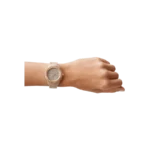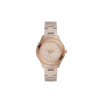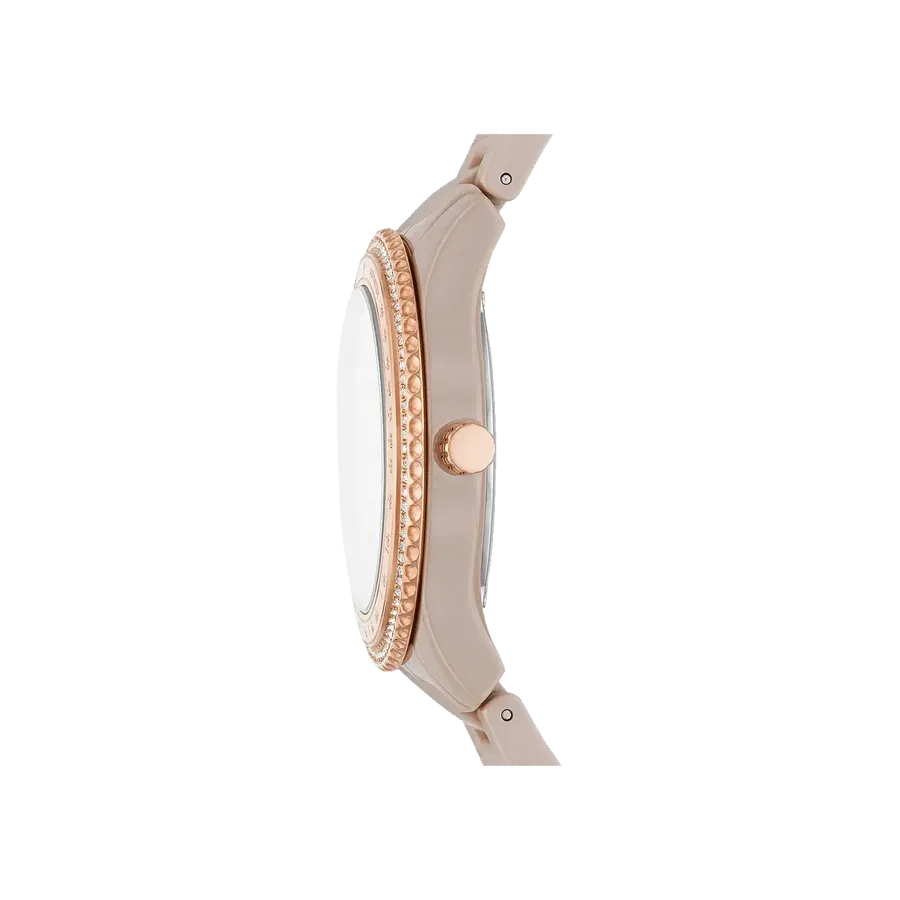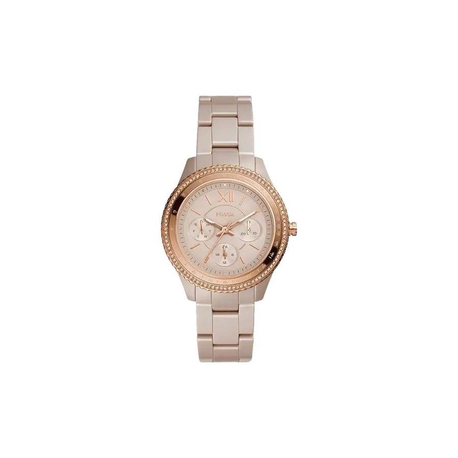 This 38mm Stella features a rose gold satin, sunray dial, multifunction movement and caramel ceramic bracelet.