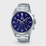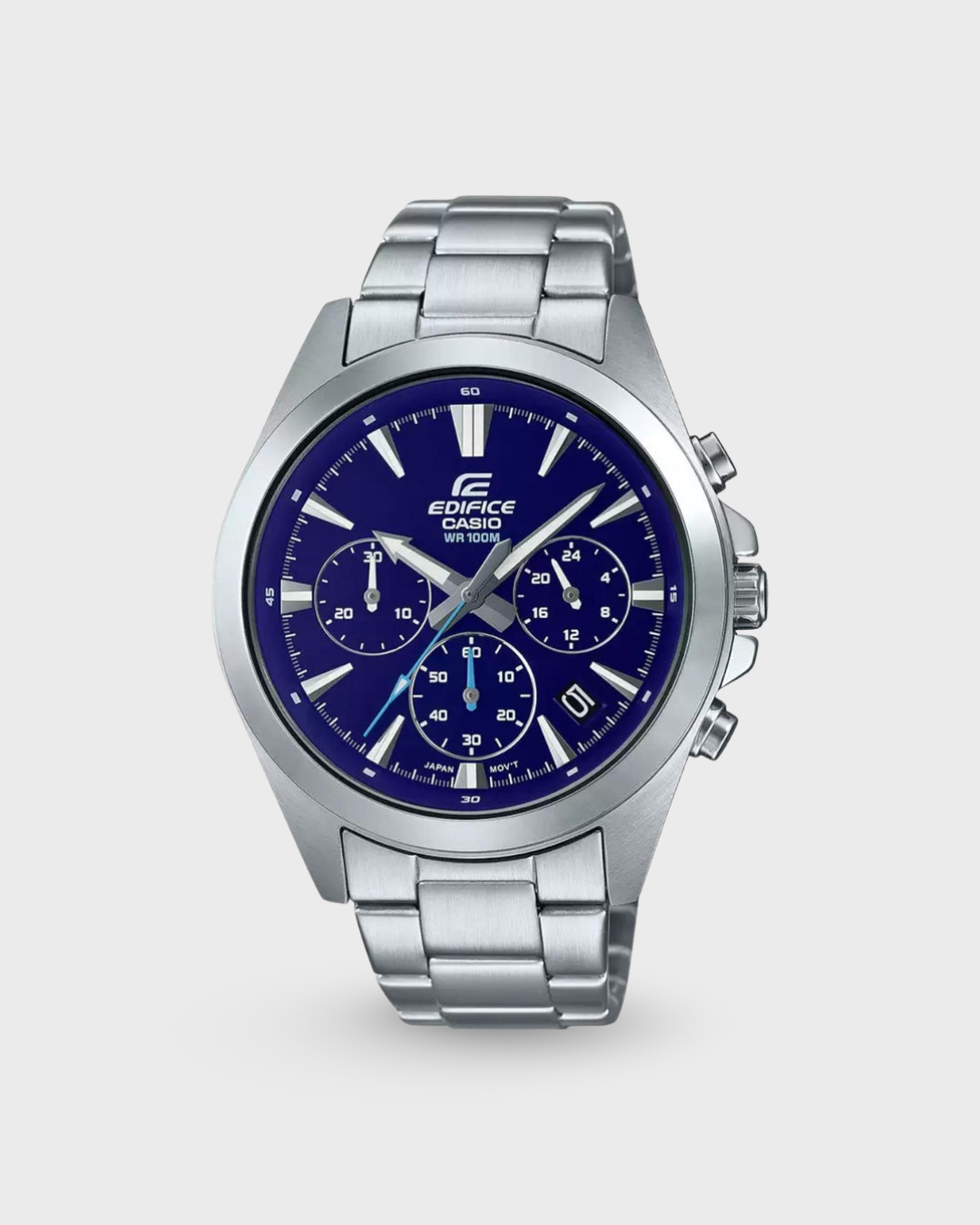 Introducing the EDIFICE EFV-630L ?? a sporty, simple take on a classic chronograph, with genuine leather band for a touch of added style.Dial Color:Blue,Strap Color:Silver,Code:ED545