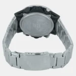 Discover Casio watch for men, featuring a black dial, a silver strap made of stainless steel in a round case. Built with mineral glass and stainless steel body to balance clarity and durability. Dimensions include 52 mm dial size, 22 mm strap width, 13 mm profile for comfortable wear. Key features: quartz movement, analog-digital display, 10 atm water resistance. A secure double locking foldover clasp ensures a dependable fit.