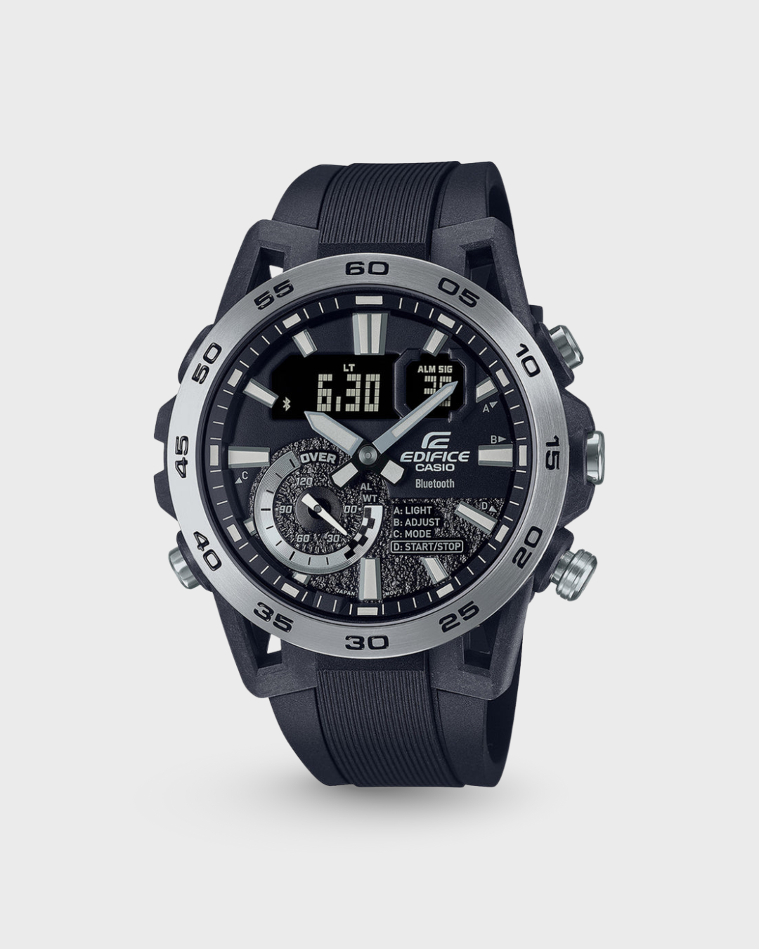 Introducing true motorsports form, functionality, and sophistication the EDIFICE SOSPENSIONE ECB-40, with carbon fiber reinforced resin suspension arm design and Smartphone Link. The unique case design is inspired by formula car suspension with lugs configured in a four-arm arrangement, two above and two below.