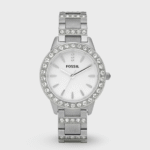 Clear stones encircle the dial of this stainless steel watch. All along the bracelet, links are decorated with shiny crystals. And for even more sparkle, a stone sits at the 12-hour mark. This Jesse watch also features a three hand movement.