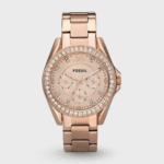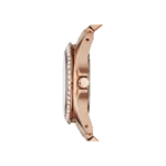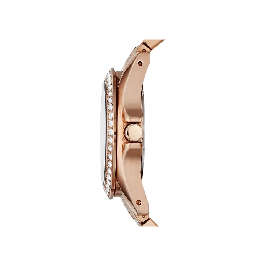 Our signature Riley style with a 45-stone topring, features a rose gold-tone finish and a textured rose dial. This Riley watch also features a multifunction movement.