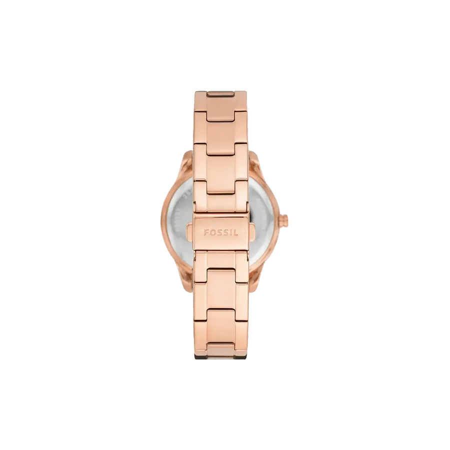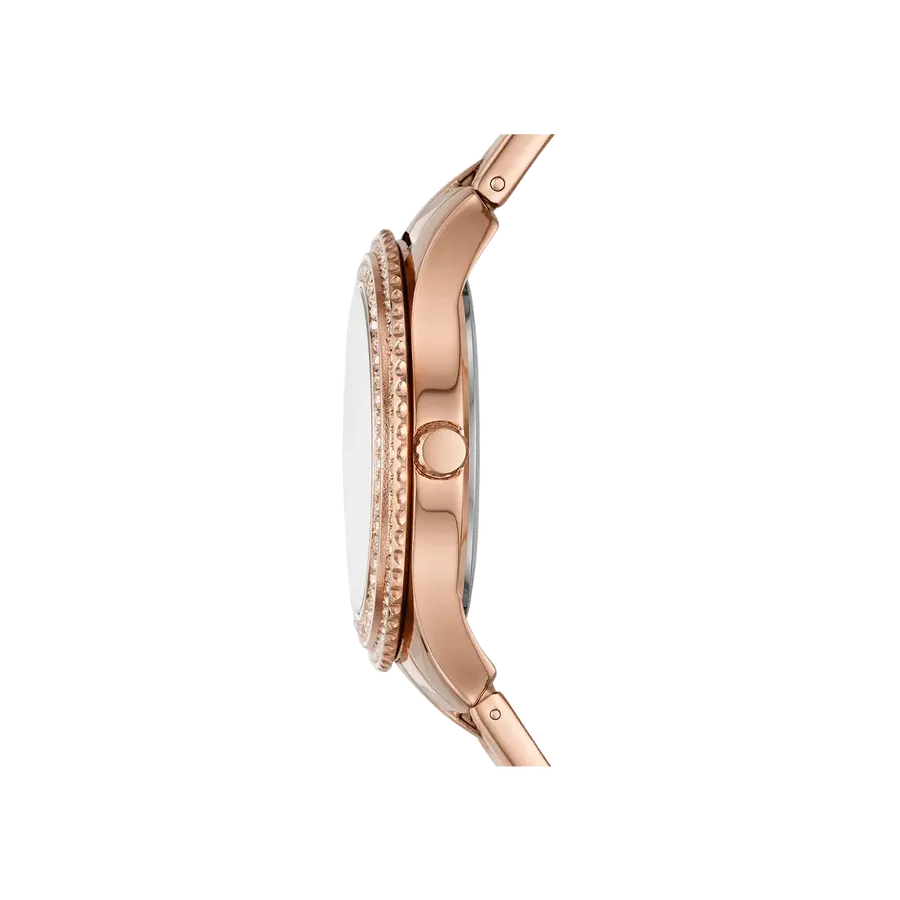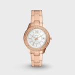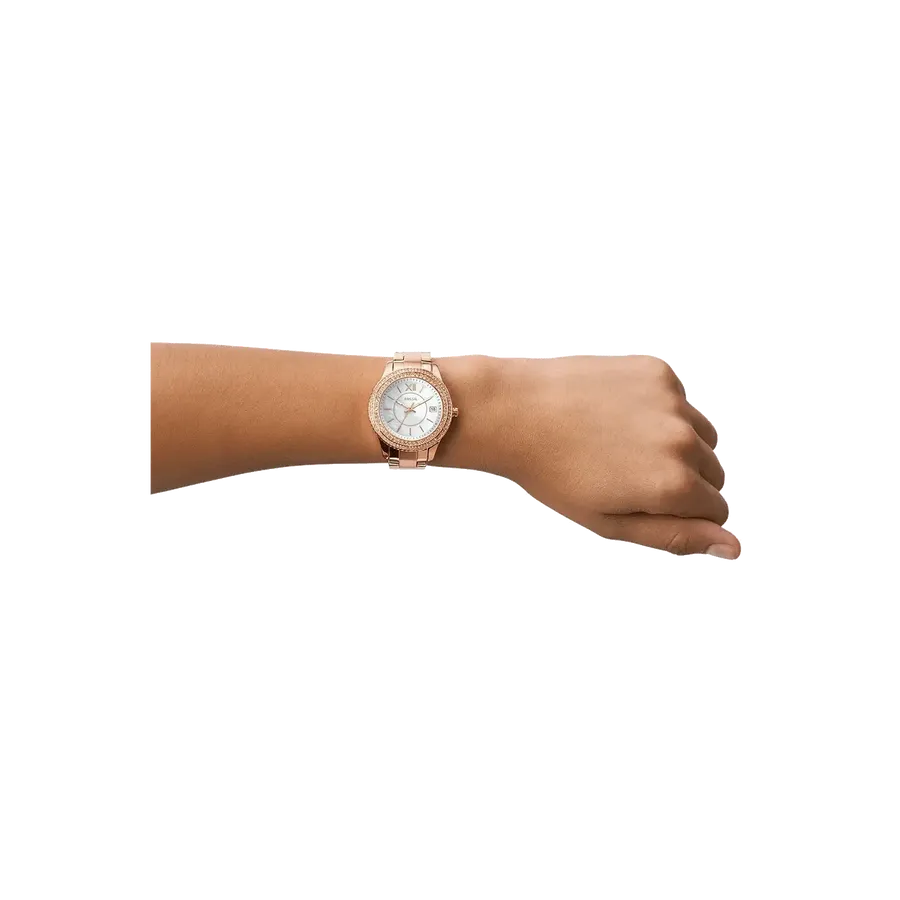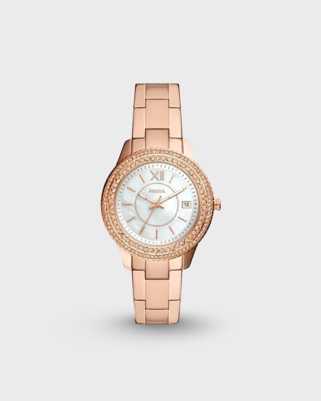This 37mm Stella features a white mother-of-pearl semi-gloss dial, three-hand date movement and rose gold-tone stainless steel bracelet.