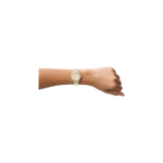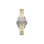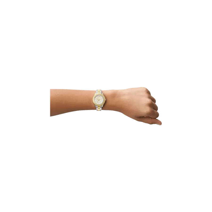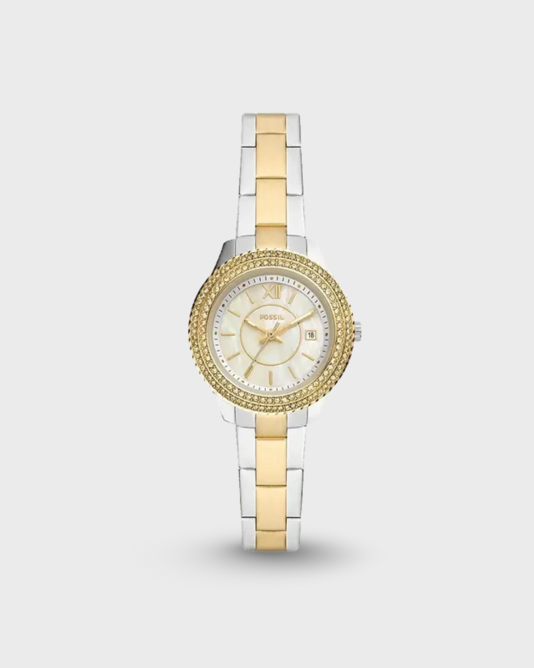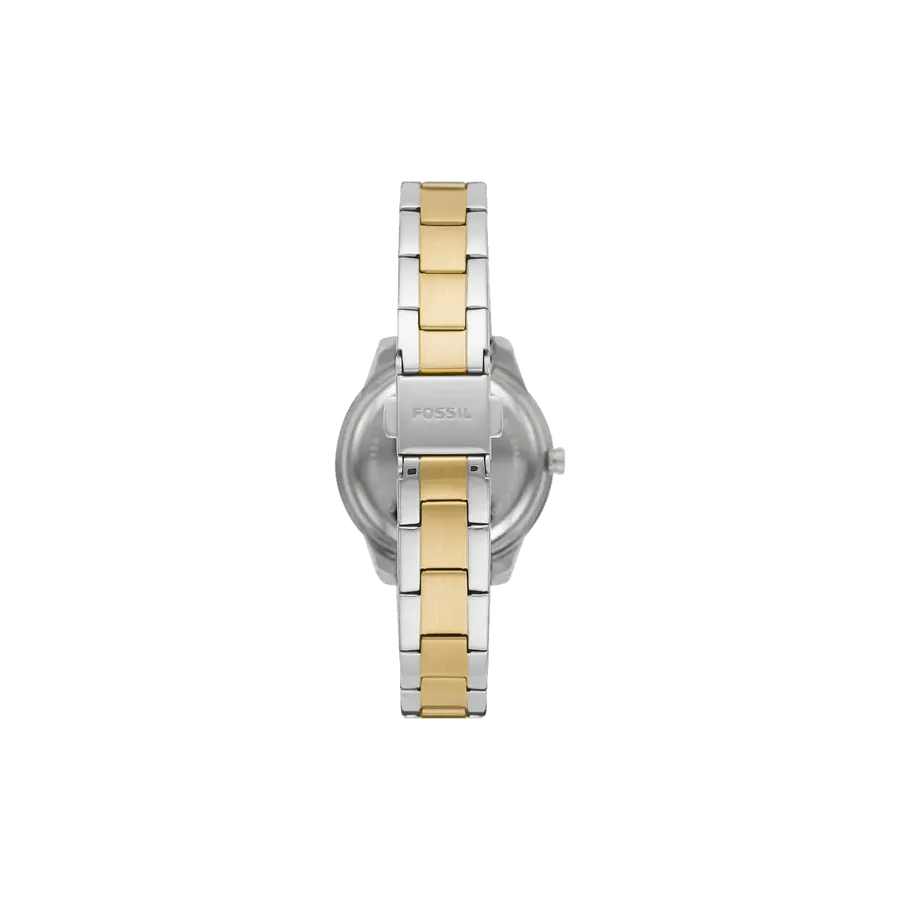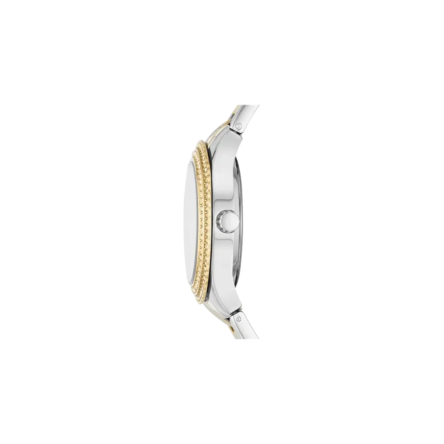 This 30mm Stella features a mop, white glossy dial, three-hand date movement and two tone silver and gold stainless steel bracelet.