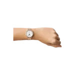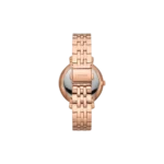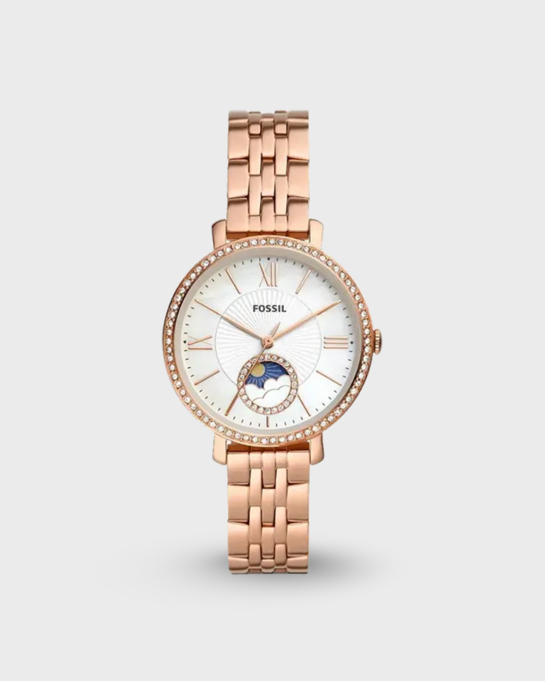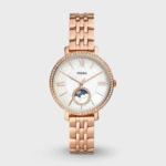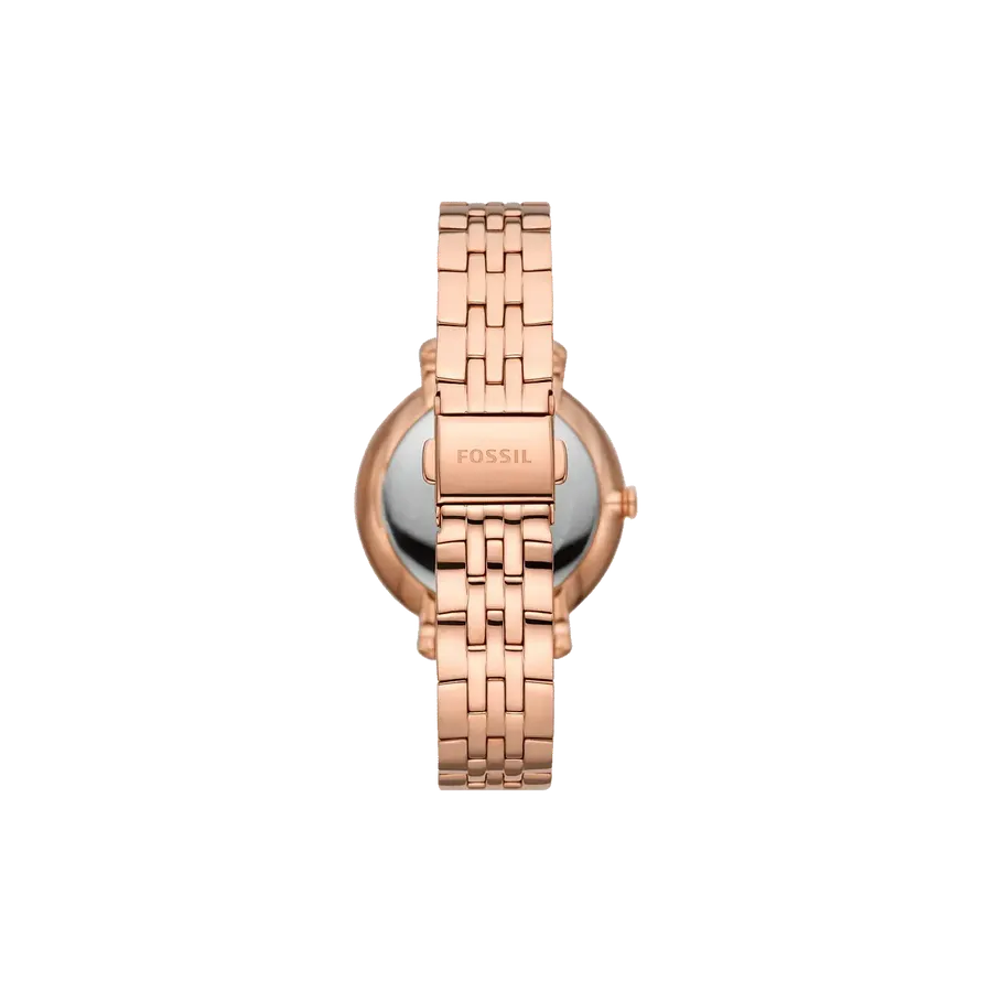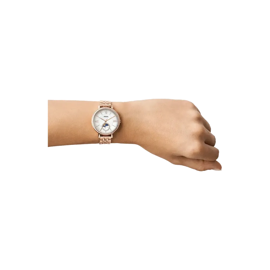 This 36mm Jacqueline features a white mother-of-pearl glossy and textured dial, sun moon multifunction movement and rose gold-tone stainless steel bracelet.