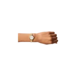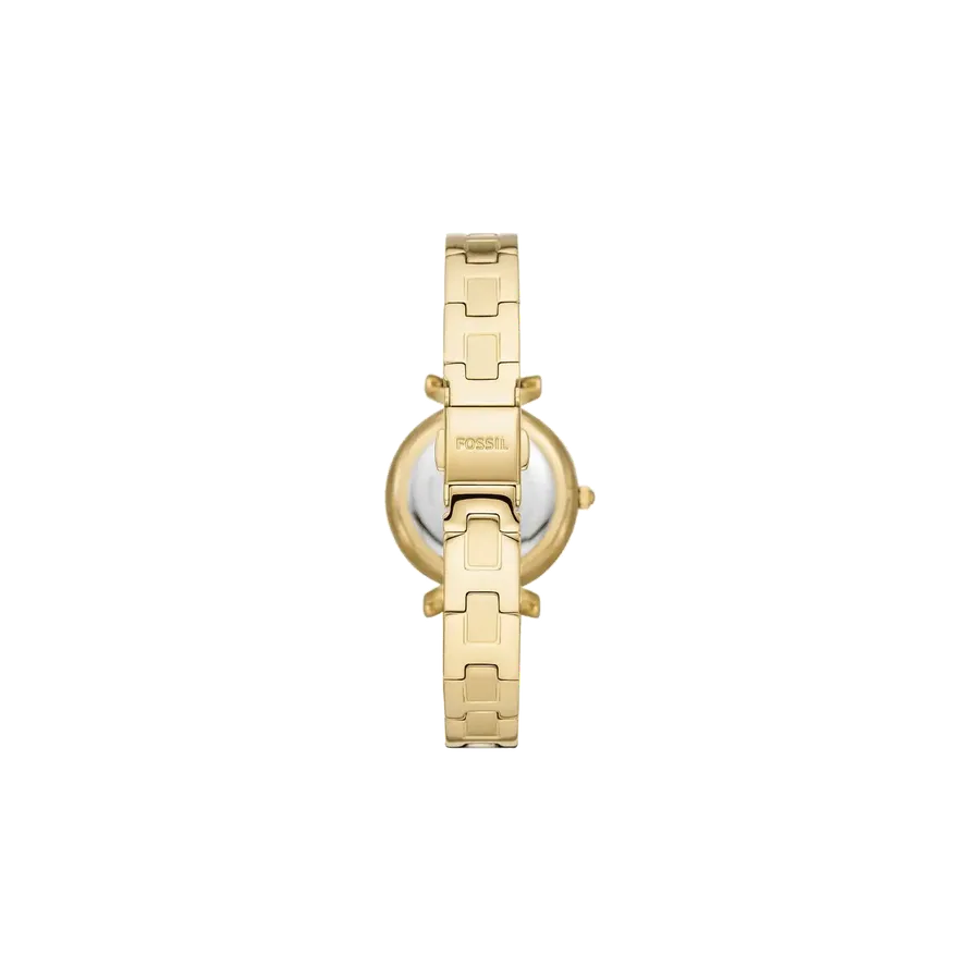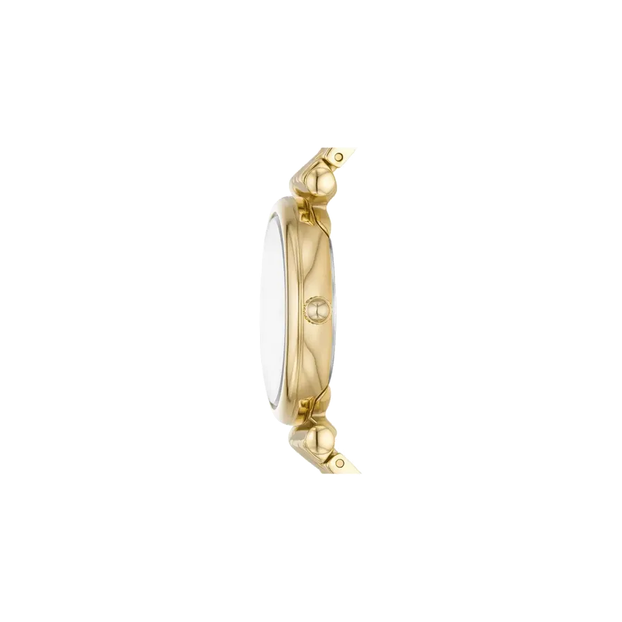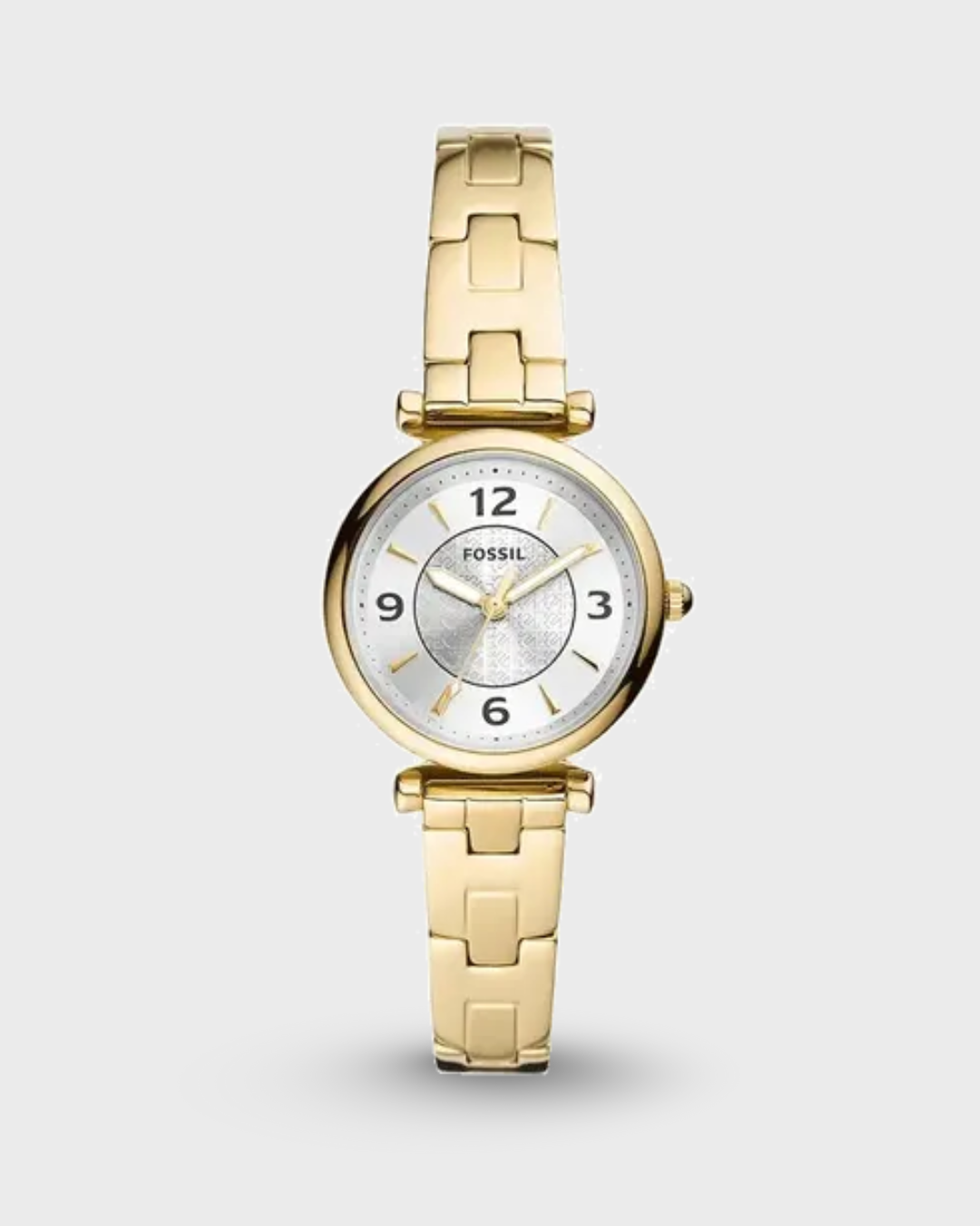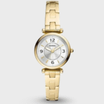 This 28mm Carlie features a silver sunray dial, three-hand movement and gold-tone stainless steel bracelet.
