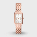 This 23mm Raquel features a white satin dial, three-hand date movement and rose gold-tone stainless steel bracelet.
