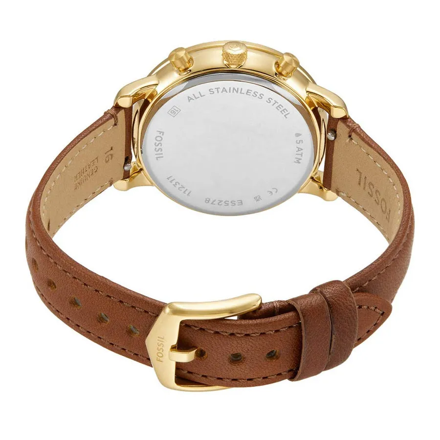This 36mm Neutra features a white mother-of-pearl dial, chronograph movement and medium brown leather strap. Fossil leather products support responsible manufacturing via the Leather Working Group.
