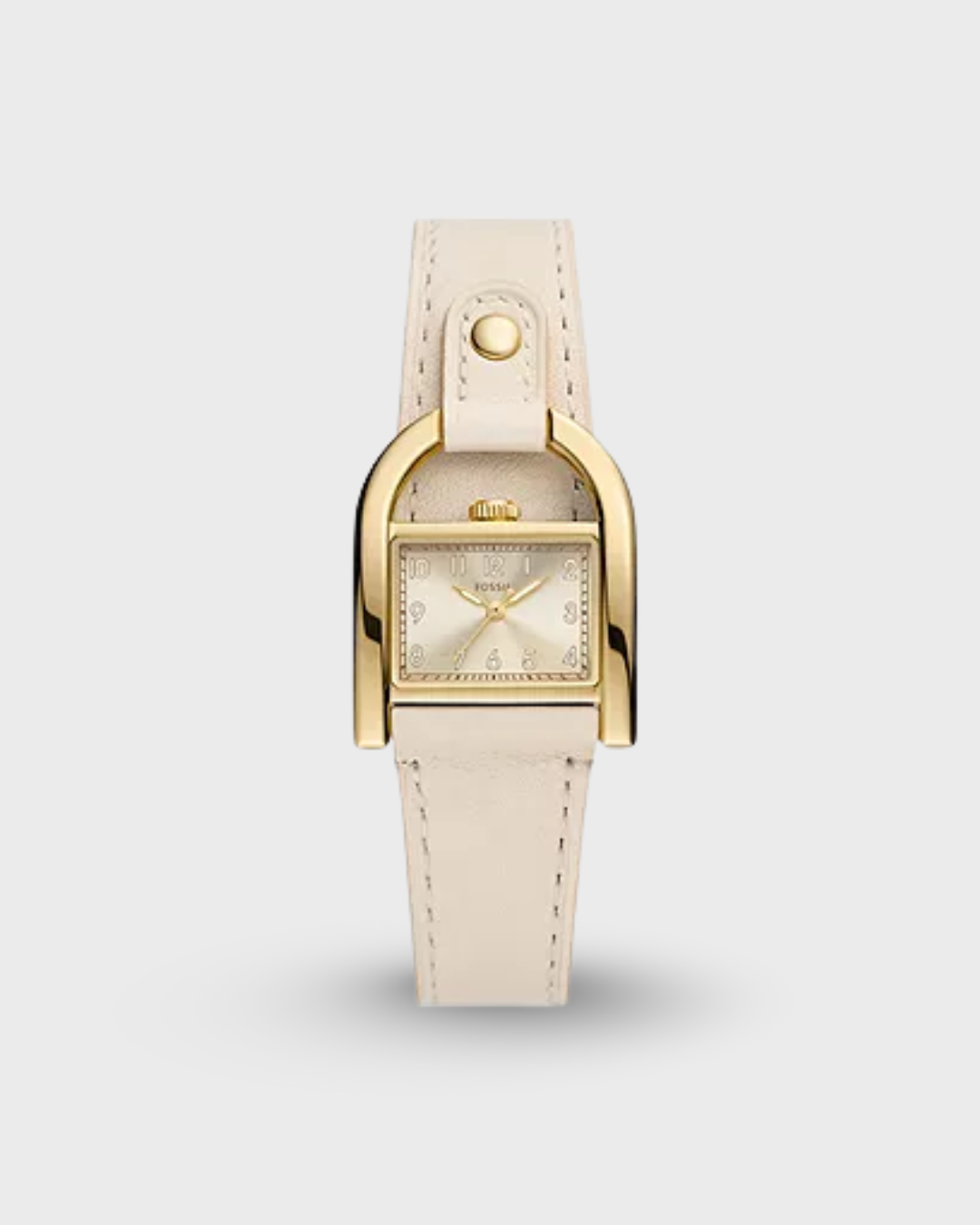 We’ve always been inspired by equestrian style—rich leathers, contrast stitching, statement hardware. This Harwell watch features all three, plus gold-tone stainless steel, a D-link-shaped case, a gold-tone sunray dial and a nude LiteHide™ leather strap. Fossil leather products support responsible manufacturing via the Leather Working Group.