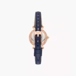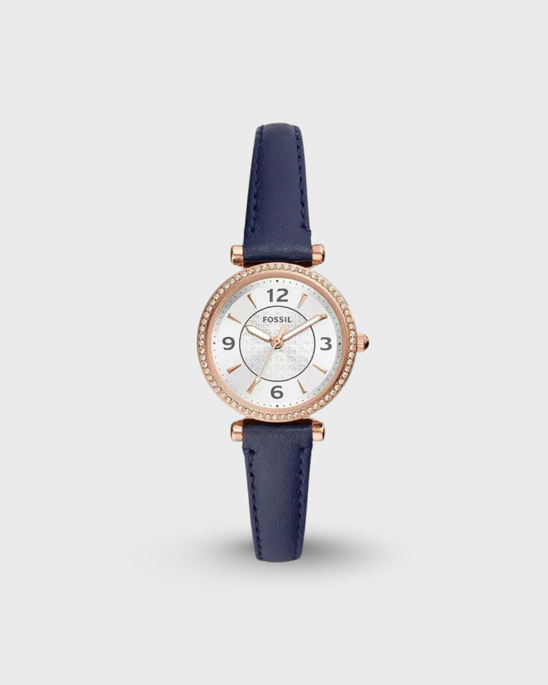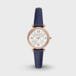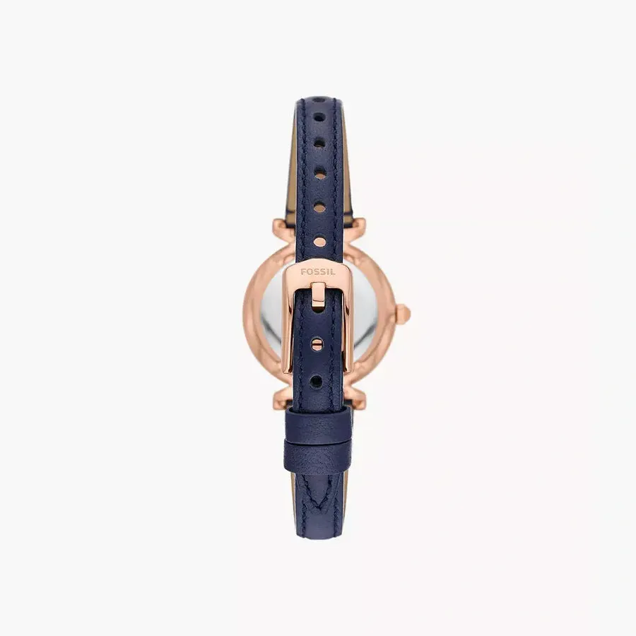 This 28mm Carlie features a silver sunray dial, three-hand movement and navy LiteHide™ leather strap. Fossil leather products support responsible manufacturing via the Leather Working Group.