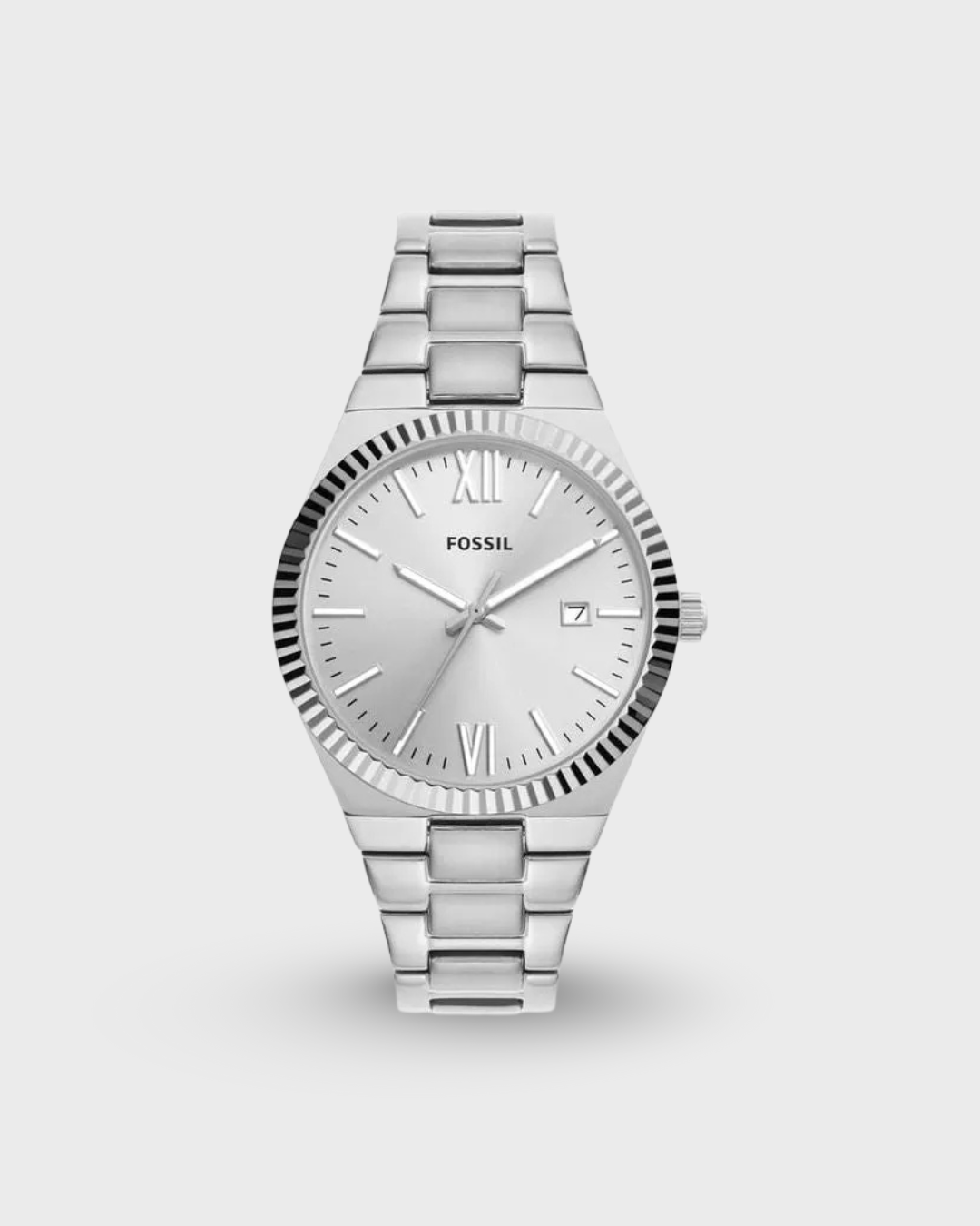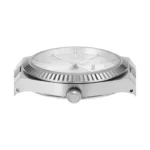 This 38mm Scarlette features a silver sunray dial, three-hand date movement and stainless steel bracelet.