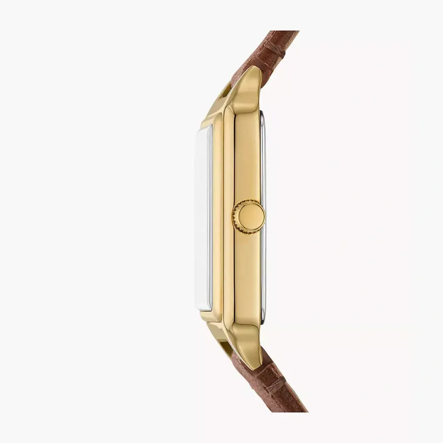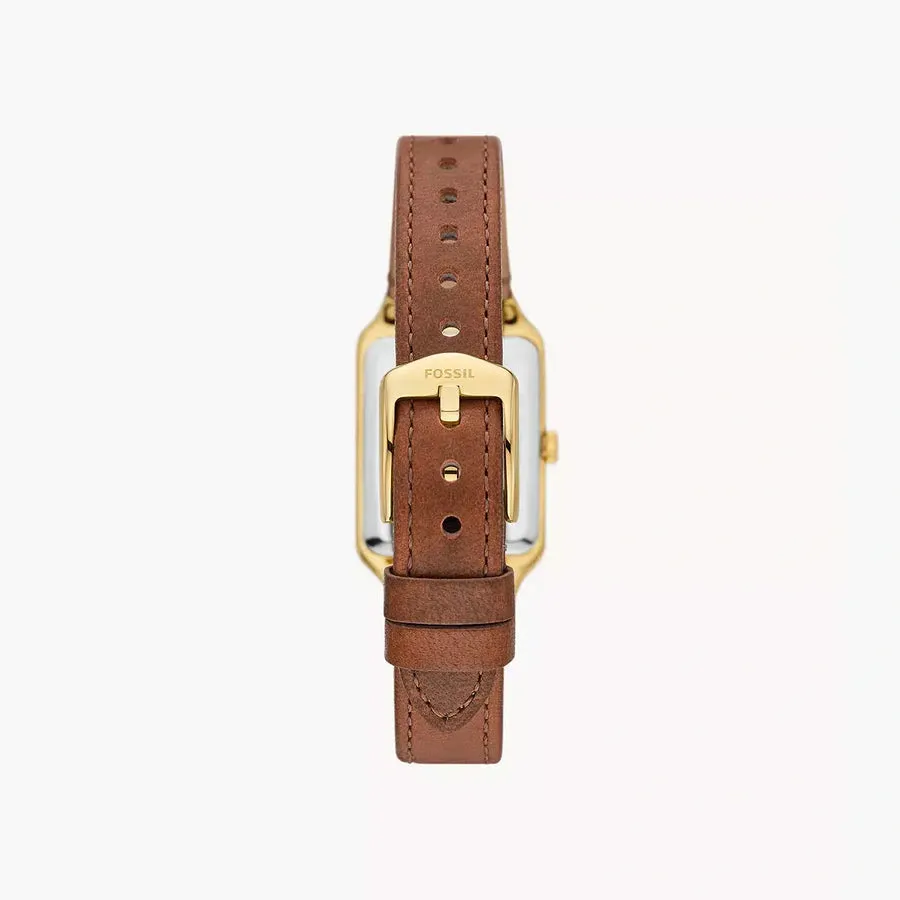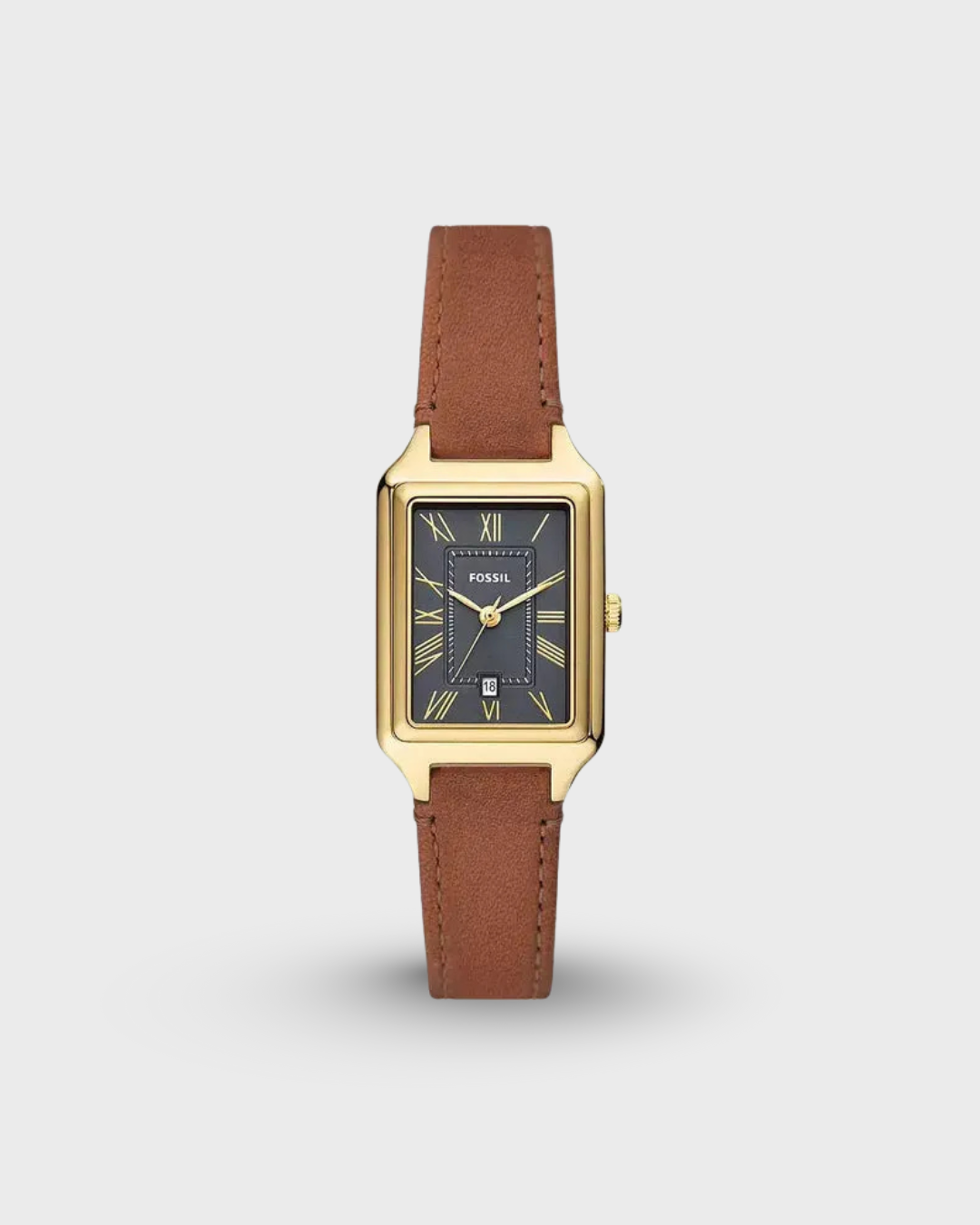 A true icon from our archives, the rectangular Raquel watch is updated for the current moment. Slim and versatile, it features a charcoal gray satin watch face, three-hand date movement and a brown leather strap. Fossil leather products support responsible manufacturing via the Leather Working Group.