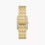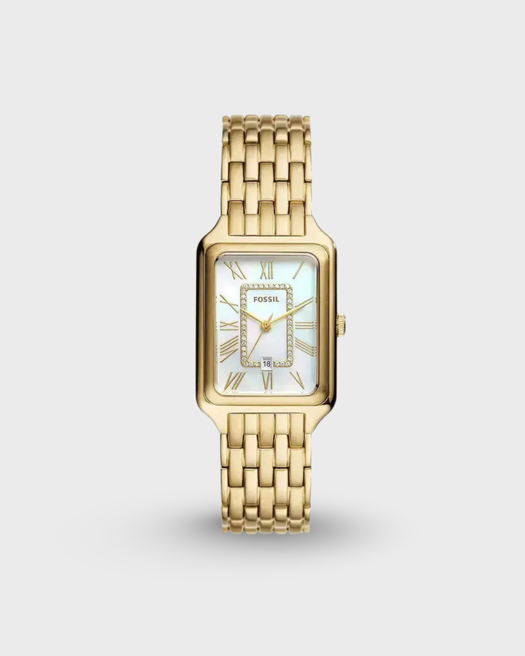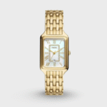 A true icon from our archives, the rectangular Raquel watch is updated for the current moment. Slim and versatile, it features a mother-of-pearl watch face with a glitz inner-frame, three-hand date movement and a brushed and polished gold-tone 7-link bracelet.