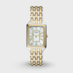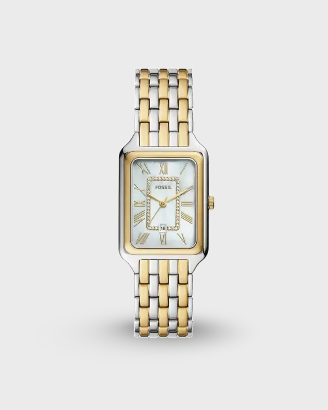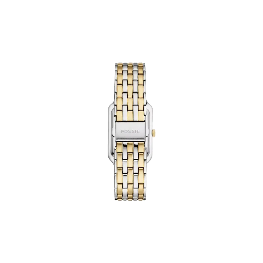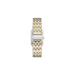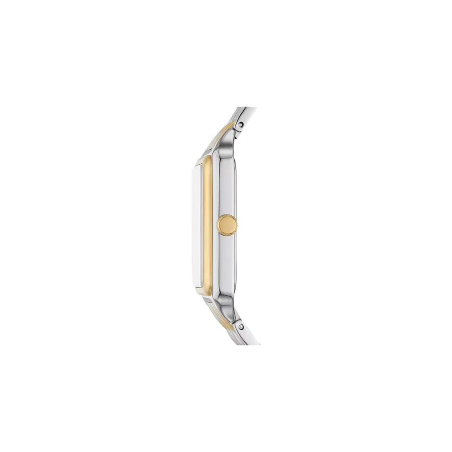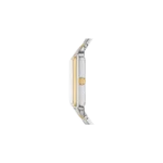 A true icon from our archives, the rectangular Raquel watch is updated for the current moment. Slim and versatile, it features a mother-of-pearl watch face with a glitz inner-frame, three-hand date movement and a brushed and polished two-tone 7-link bracelet.
