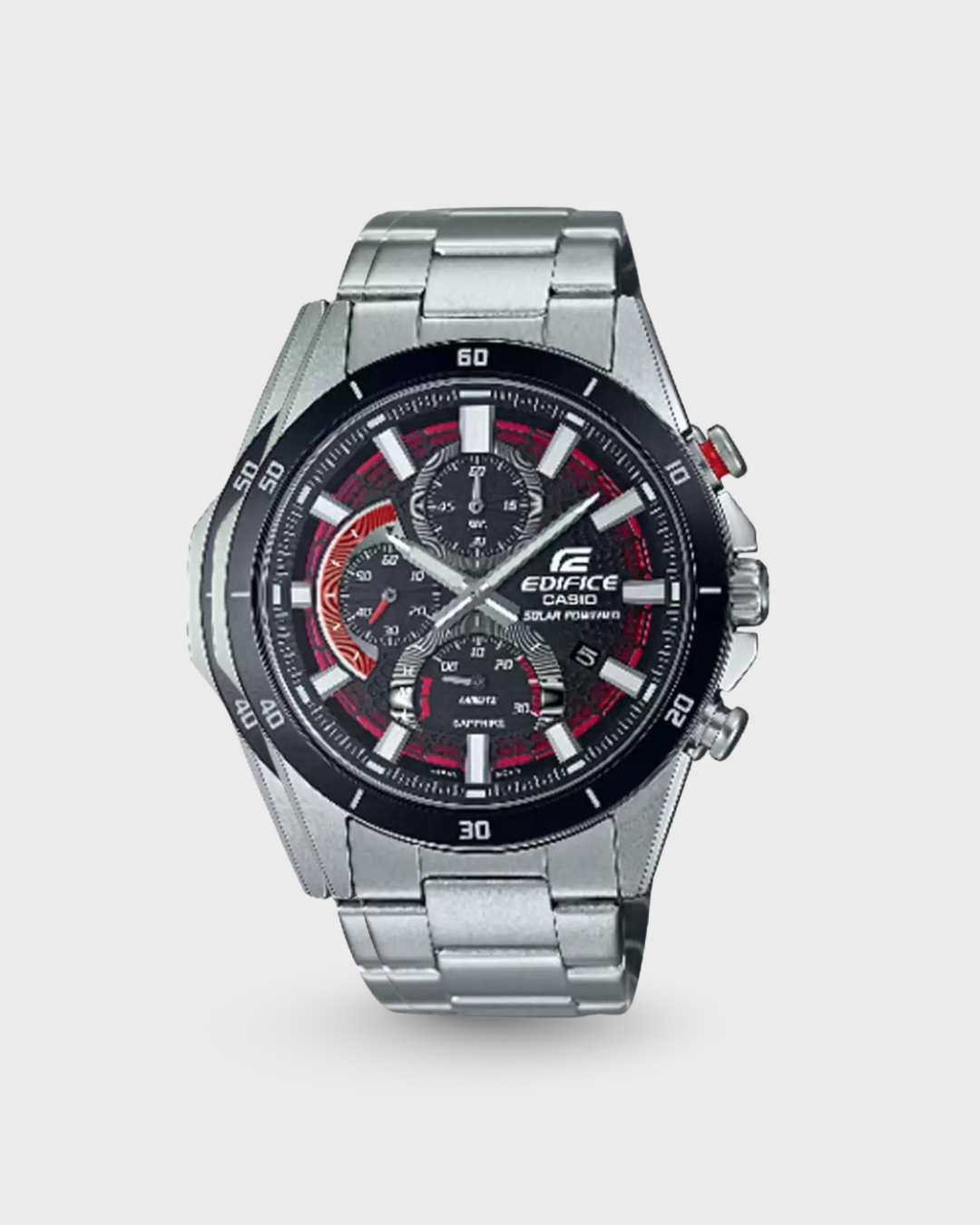 Slim, sporty, and solar-powered bold and special EFS-S6Xchronograph. The slim case, less than 10mm thick, gives you the comfortable fit you want in the multi-dial sporty chronograph design you love. The metal mesh dial evokes the front grille of a sports car to project pure sporty speed, and the scratch-resistant sapphire crystal delivers high transparency and an easy read.