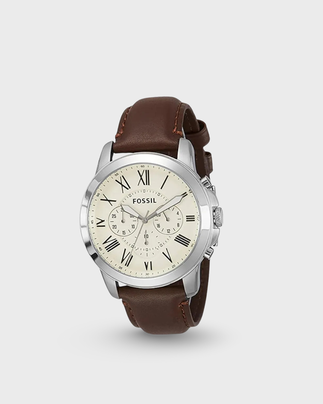 Sku: FS4735 Case Size: 44MM Movement: Quartz Chronograph Platform: Grant Strap Material: Genuine Leather Water Resistance: 5 ATM Case Material: Stainless Steel Case Color: Silver Dial Color: Cream Strap Fashion Color: Brown Interchangeable Compatibility: 22MM Strap Width: 22MM Closure: Strap Buckle Strap Inner Circumference: 200+/- 5MM Battery Type: SR621SW
