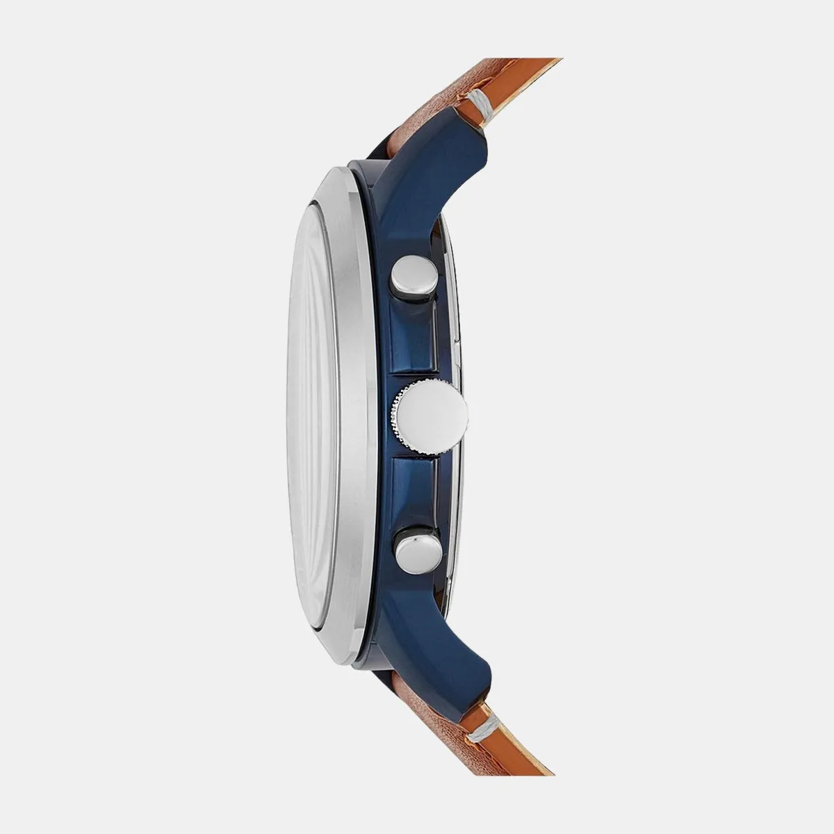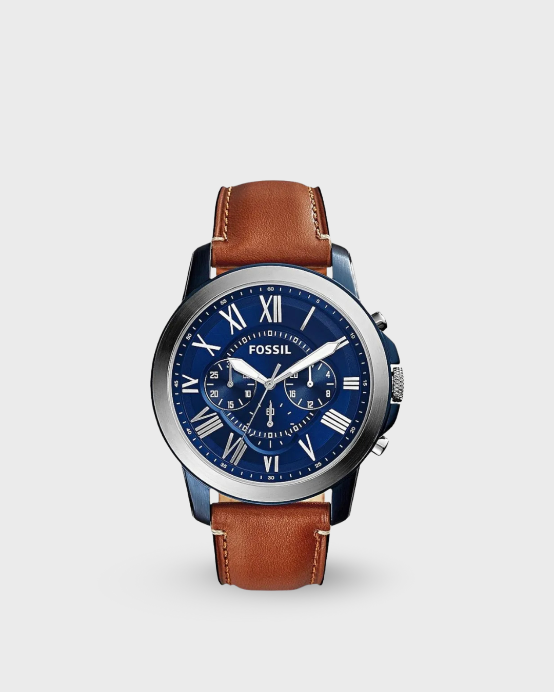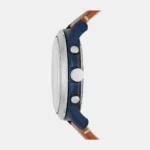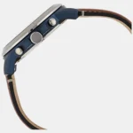 Stainless steel case with a light brown leather strap. Fixed stainless steel bezel. Blue dial with luminous silver-tone hands and Roman numeral hour markers. Minute markers around the outer rim. Dial Type: Analog. Luminescent hands and markers. Chronograph – three sub-dials displaying: 60 second, 30 minute and 24 hour. Quartz movement. mineral crystal. Solid case back. Case size: 44 mm. Case thickness: 12 mm. Round case shape. Band width: 22 mm. Band length: 7.85 inches. Tang clasp. Water resistant at 50 meters / 165 feet. Functions: chronograph, hour, minute, second. Sport watch style.