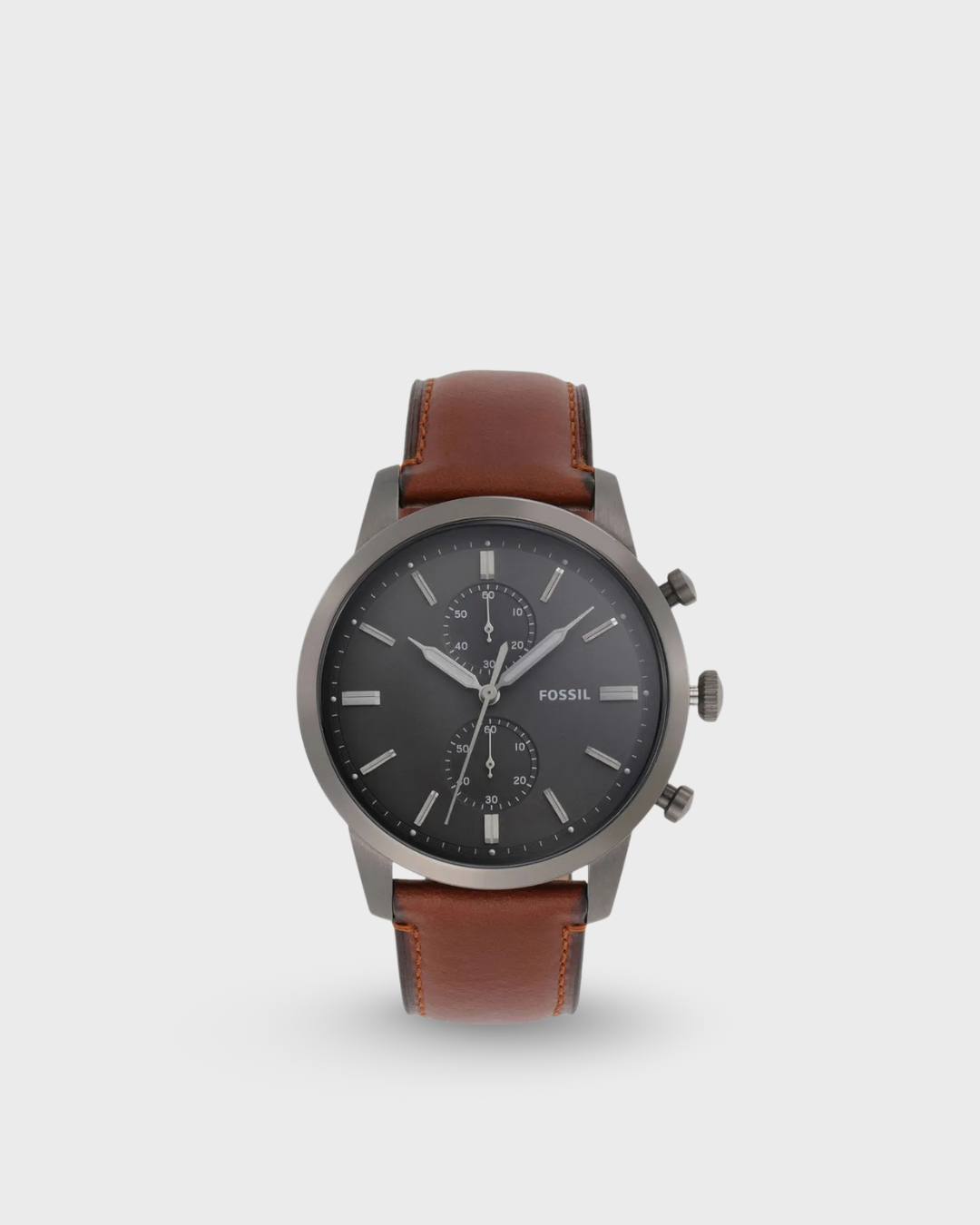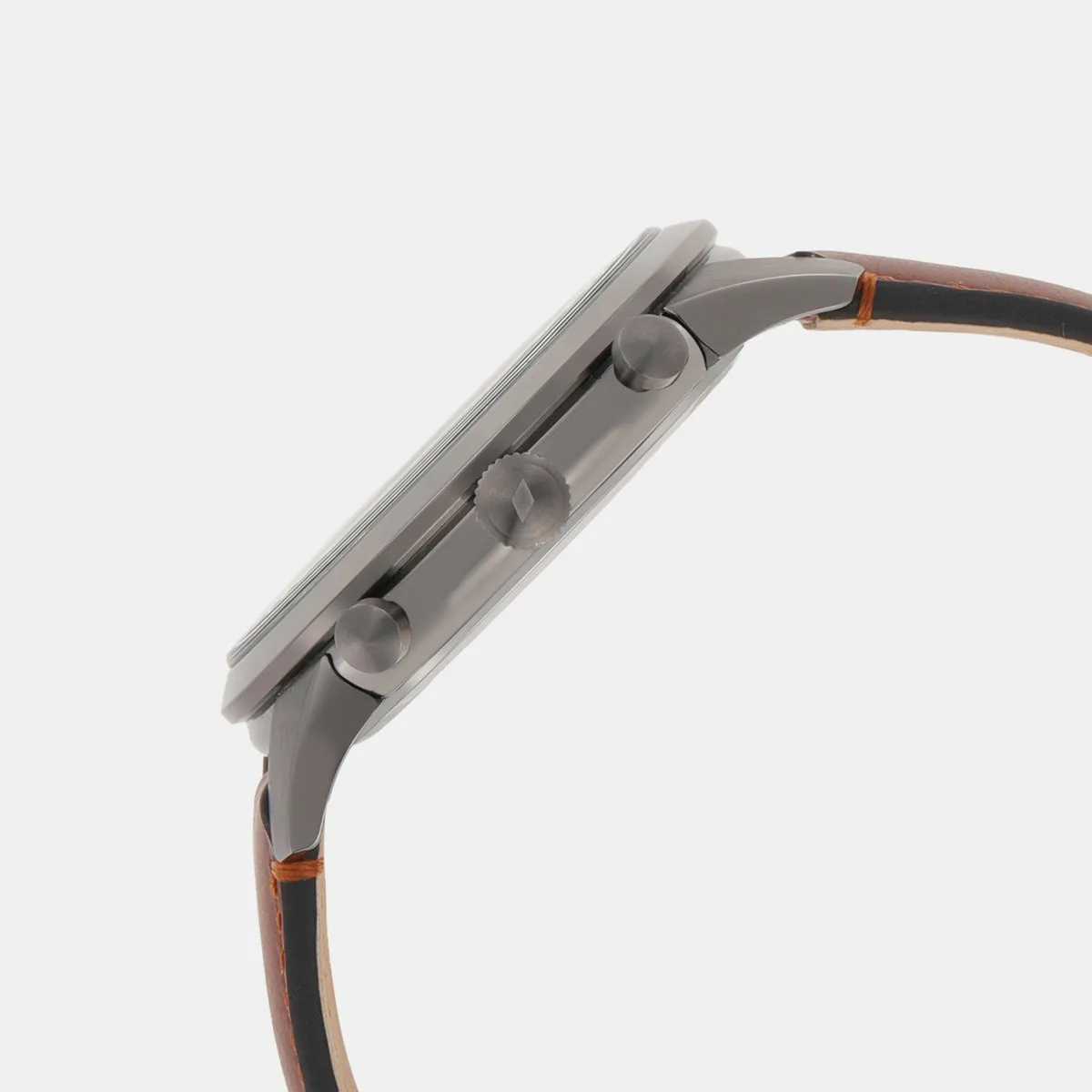 A perfect fusion of style and functionality, this men’s analog watch from the Townsman collection by Fossil will be a fine addition to your watch collection. Be it desk, dinner or daily commute, Townsman timepieces will be the best-dressed essential for you. The dark grey round dial exudes plain three hands, stick markings at five-minute intervals, two subdials, two pushers and a crown for time adjustment. The amber genuine leather strap vaunts a brown hue which further adds to the design. This watch is compatible with all 22mm straps that will let you customize your look.
