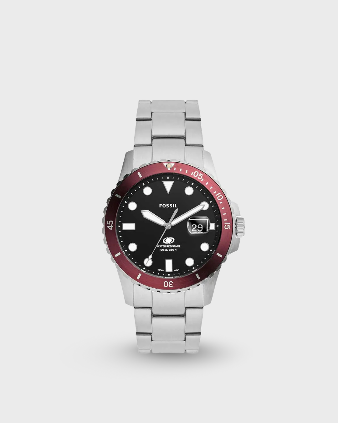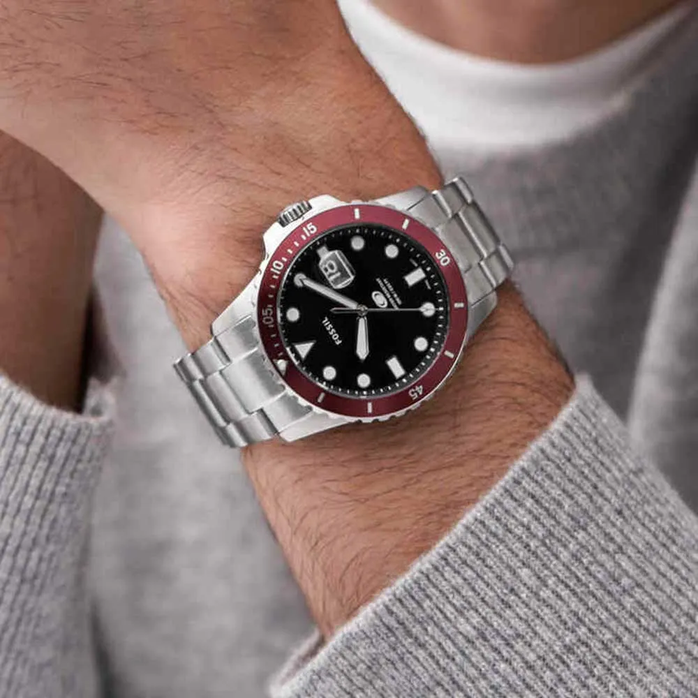 Purposeful design details define this time-honored, dive-inspired collection, Fossil Blue. This timepiece is expertly crafted with a 3-link stainless steel bracelet, geometric indices, 100-meter water resistance and a unidirectional rotating topring in of-the-moment crimson. Add a tinge of subtlety to your look with this men’s analog watch from FOSSIL. The black round dial is protected by a mineral glass. The stainless steel strap comes in a silver hue that further elevates the look of the timekeeper