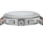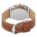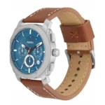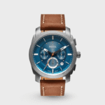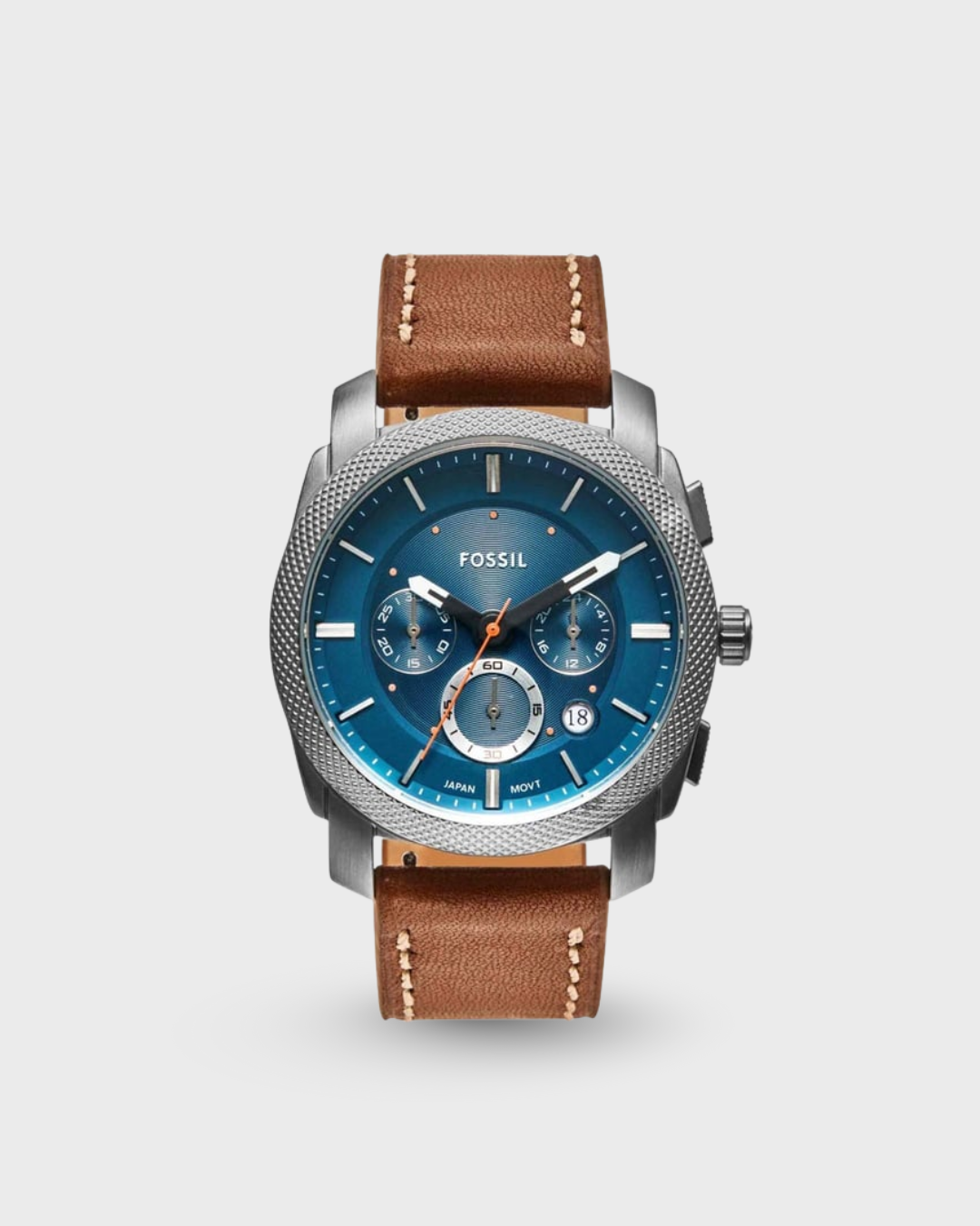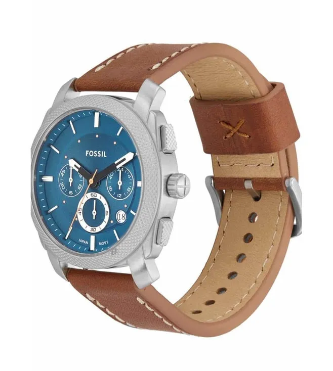 This 42mm Machine features a blue satin textured dial, chronograph movement and brown leather strap. Fossil leather products support responsible manufacturing via the Leather Working Group.