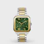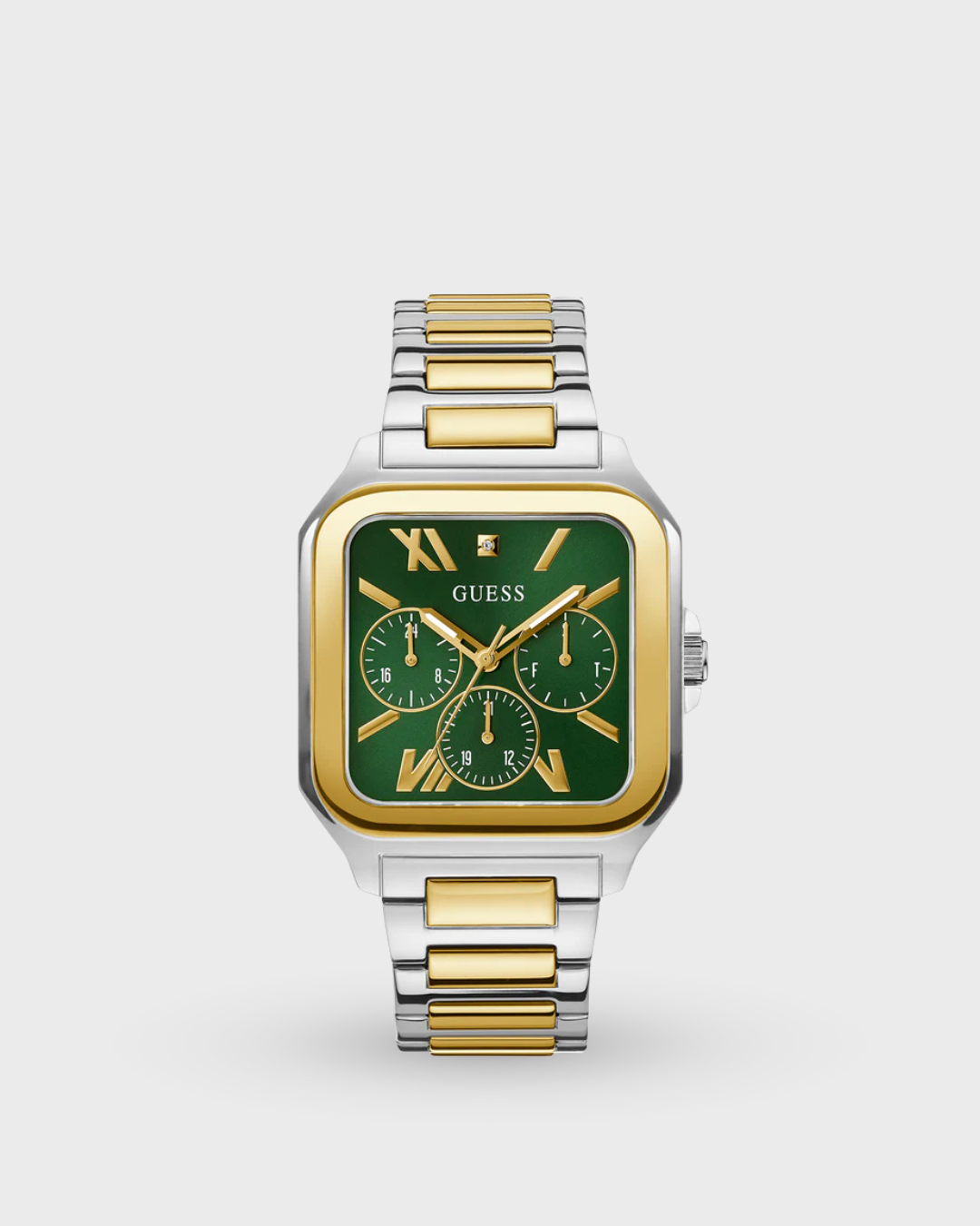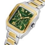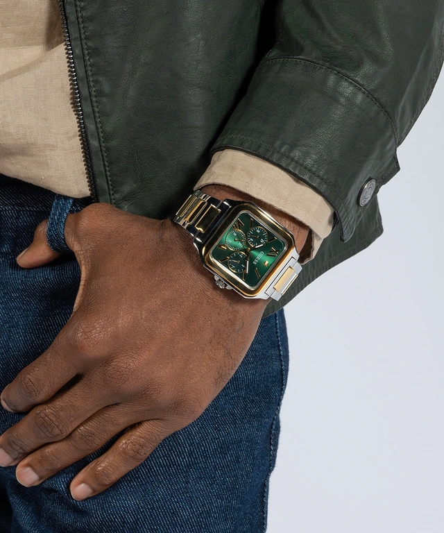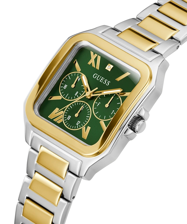 Discover Guess watch for men, featuring a green dial, a two tone strap made of stainless steel in a square case. Built with mineral glass and stainless steel body to balance clarity and durability. Dimensions include 42 mm dial size, 22 mm strap width, 11 mm profile for comfortable wear. Key features: quartz movement, chronograph display, 10 atm water resistance. A secure pilot buckle ensures a dependable fit.