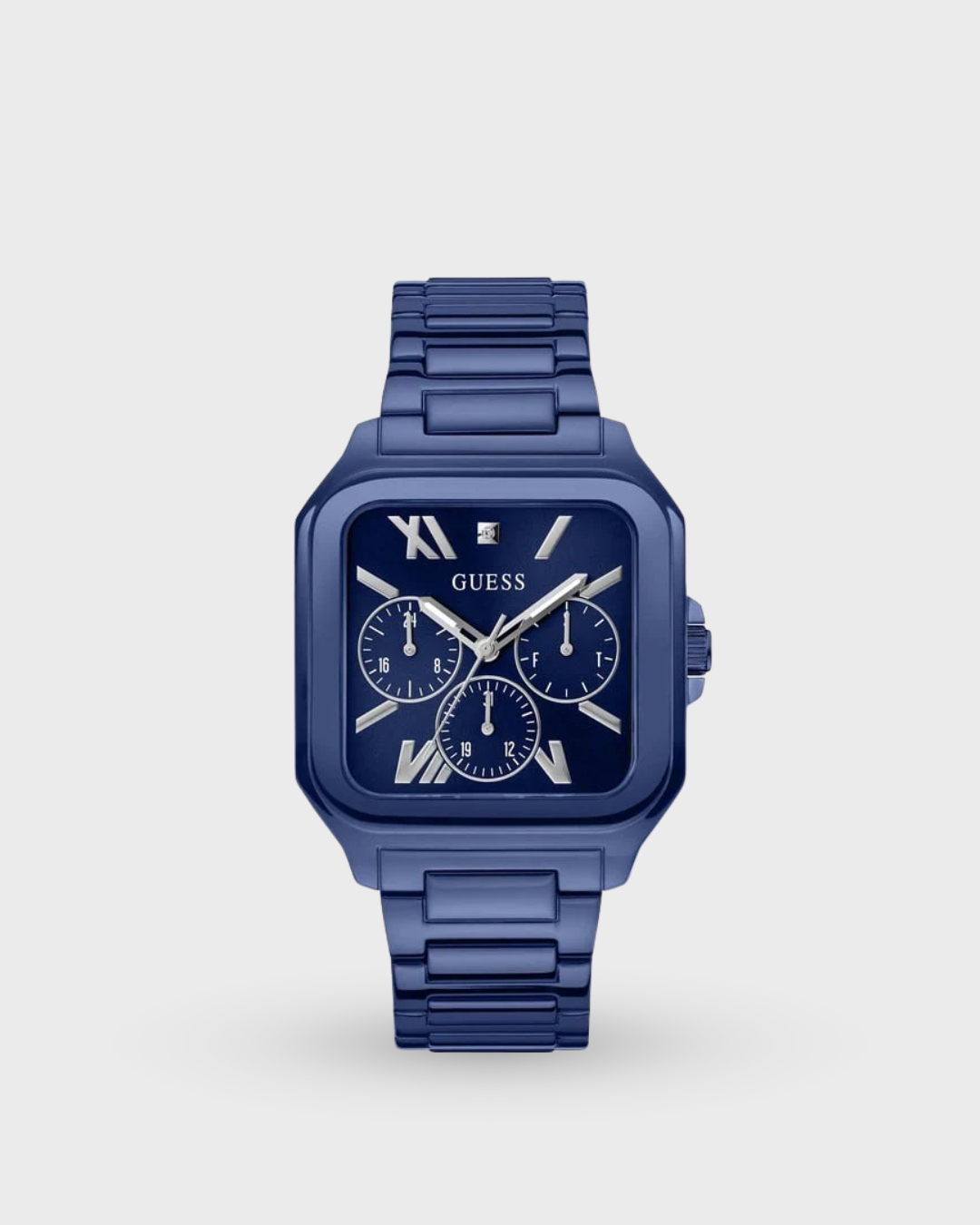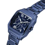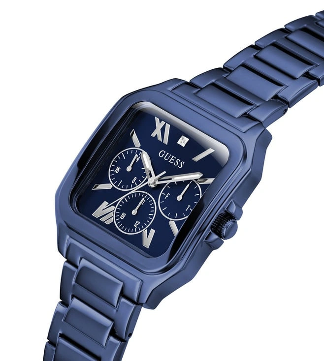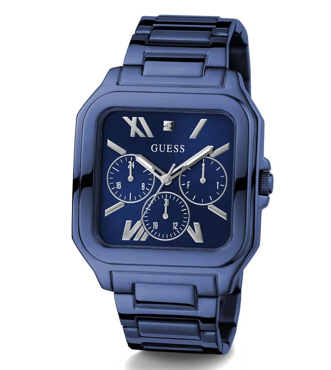Unleash your adventurous side with this male chronograph wristwatch. The square 42 mm case and blue dial, made of stainless steel, showcase a bold design. The stainless steel strap, 22 mm wide, features a pilot buckle. With chronograph display and quartz movement, this watch is water-resistant up to 1 ATM. Ideal for casual wear, it weighs 120 gm, has an 11 mm case thickness, and comes with a 2-year warranty. Proudly made in the USA.