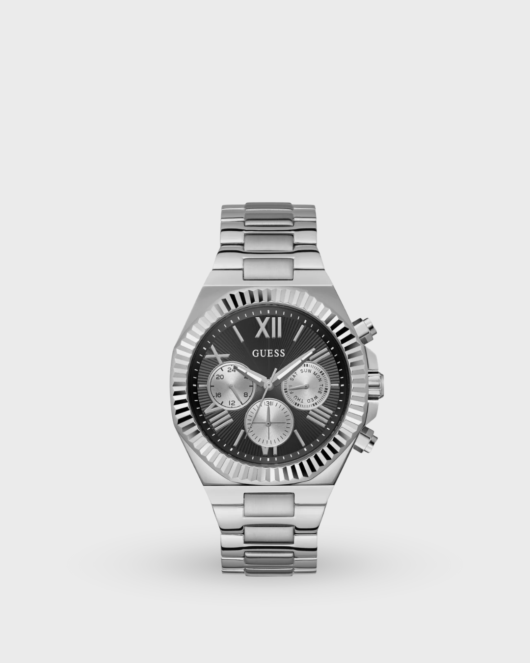 This new oversized dress style features a coin edge bezel and chrono-look multi-function dial on a sleek 3-link bracelet.