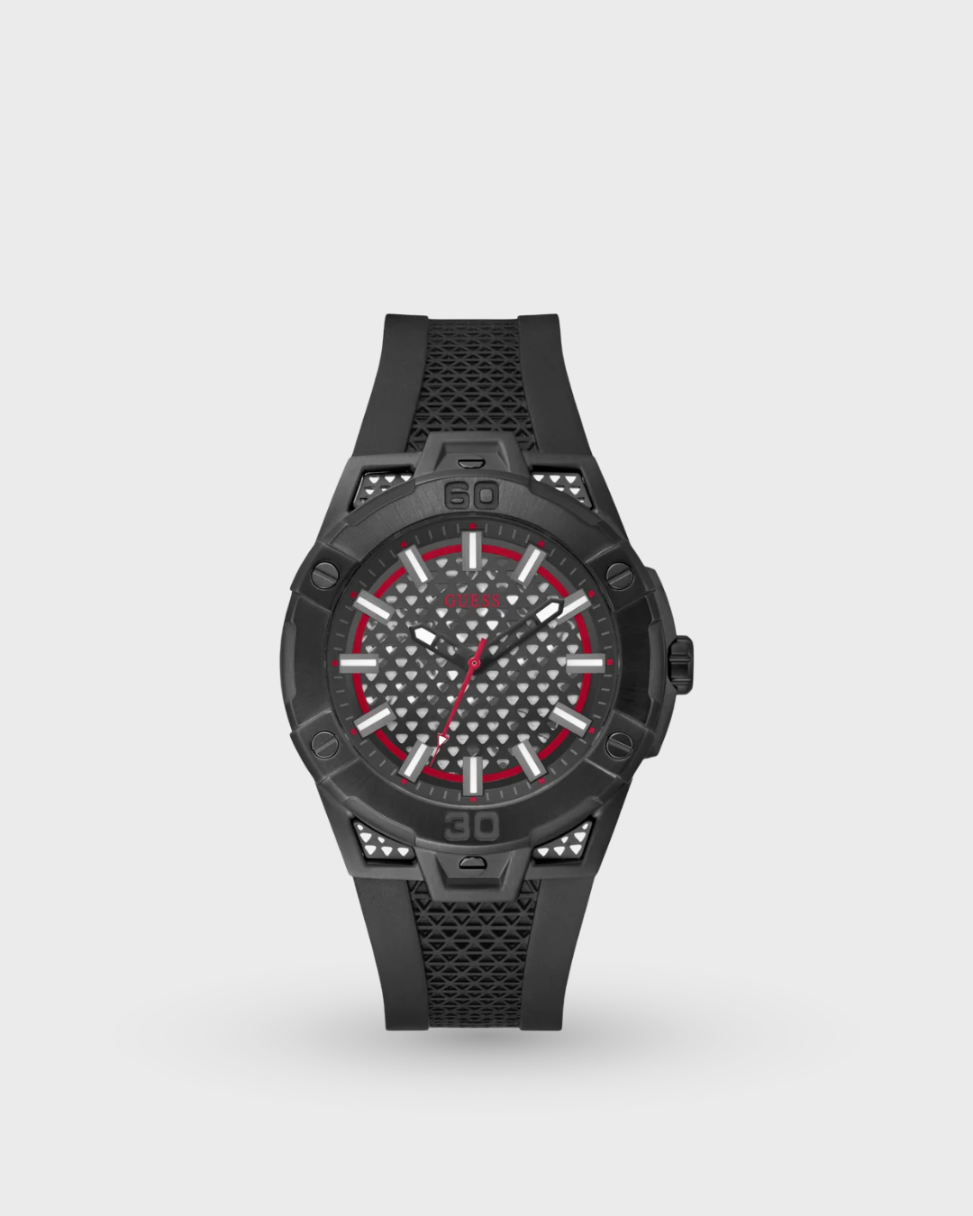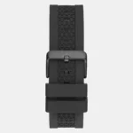 Discover Guess watch for men, featuring a black dial, a black strap made of silicone in a round case. Built with mineral glass and recycled steel body to balance clarity and durability. Dimensions include 44 mm dial size, 10.8 mm profile for comfortable wear. Key features: quartz movement, analog display, 5 atm water resistance. A secure strap buckle ensures a dependable fit.