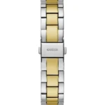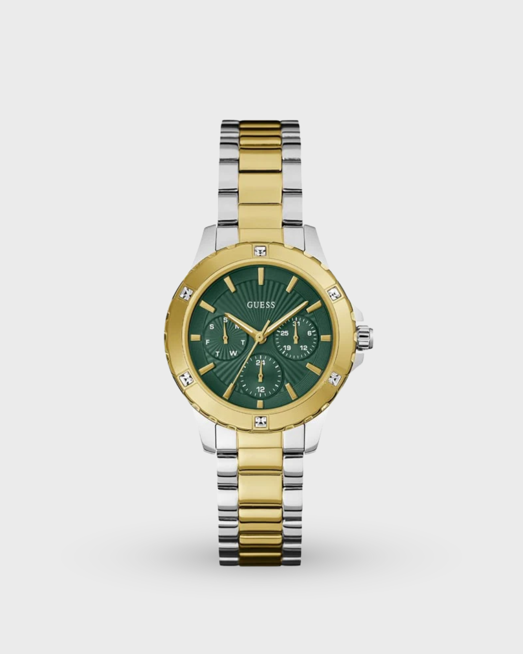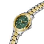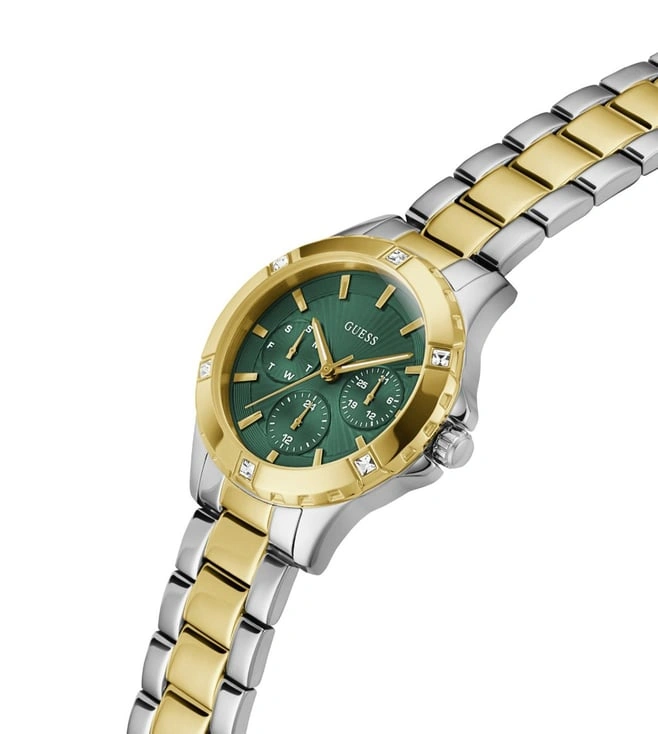 Discover Guess watch for women, featuring a green dial, a two tone strap made of stainless steel in a round case. Built with mineral glass and recycled steel body to balance clarity and durability. Dimensions include 35 mm dial size, 10.5 mm profile for comfortable wear. Key features: quartz movement, analog display, 5 atm water resistance. A secure pilot buckle ensures a dependable fit.