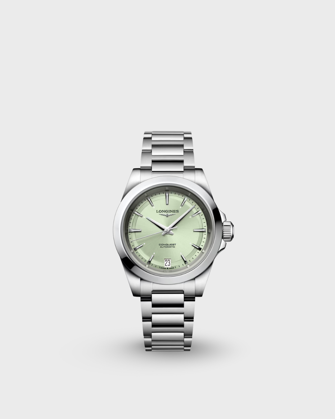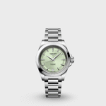 This new Conquest is driven by an exclusive Longines self-winding mechanical movement. Presented in a 34 mm steel case water-resistant up to 10 bar (100 m), it features a snailed pastel-green sunray dial with rhodium-plated hands and applied rhodium-plated hour markers with Super-LumiNova® treatment. The date aperture is at 6 o’clock. The watch comes with a stainless steel bracelet.