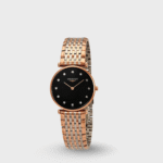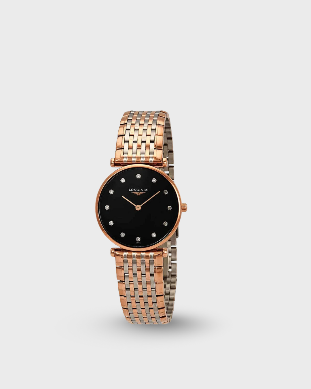 Black dial enhanced by rose gold-tone hands. Rose Gold PVD stainless steel case with a two-tone (silver-tone and rose gold pvd stainless steel band. Quartz movement. 30 meters / 100 feet water resistance. Fixed bezel. Scratch Resistant Sapphire crystal. Solid caseback. Fold Over with Push Button Release clasp. Pull / Push crown. Case size 29 mm x 4.5 mm. Band 16 mm x long. Longines L4.512.1.57.7 La Grande Classique Watch.
