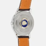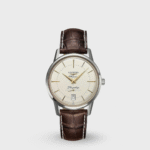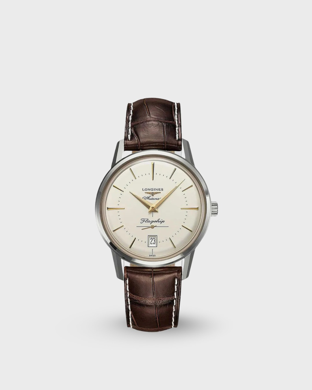Silver dial enhanced by gold-tone hands. Silver-tone stainless steel case with a brown leather band. Automatic movement. 30 meters / 100 feet water resistance. Fixed bezel. Scratch Resistant Sapphire crystal. Solid caseback. Tang clasp. Pull / Push crown. Case size 38.5 mm x 10.75 mm. Band 20.3 mm x 8 incheslong. Longines L4.795.4.78.2 Flagship Watch.