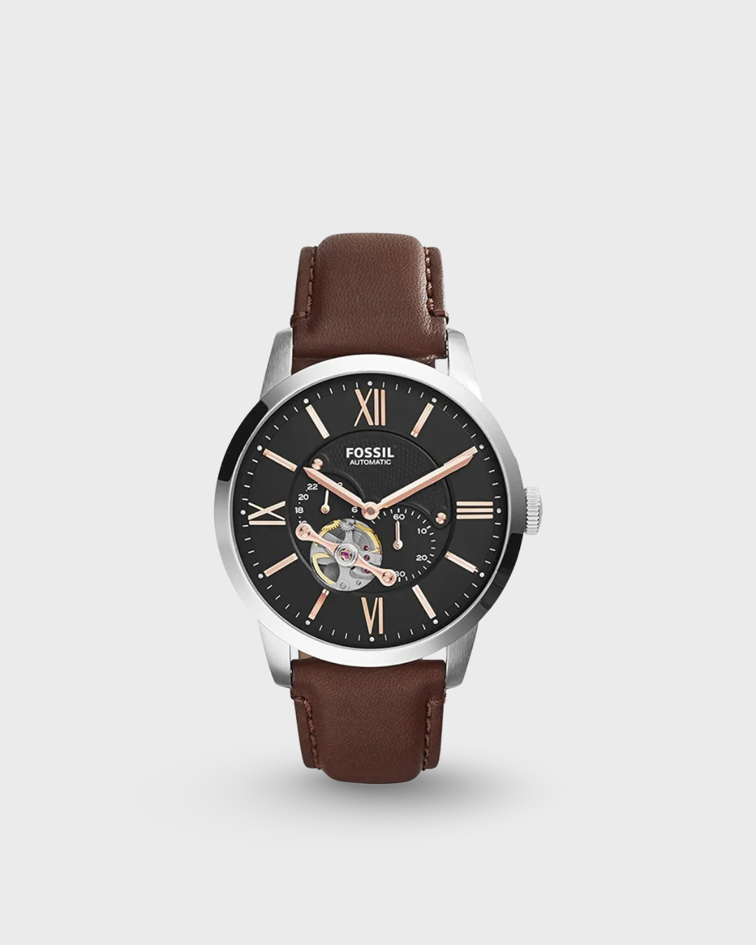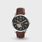 Discover Fossil watch for men, featuring a black dial, a brown strap made of leather in a round case. Built with mineral glass and stainless steel body to balance clarity and durability. Dimensions include 45 mm dial size, 22 mm strap width, 12 mm profile for comfortable wear. Key features: automatic movement, multi-function display, 5 atm water resistance. A secure buckle clasp ensures a dependable fit.