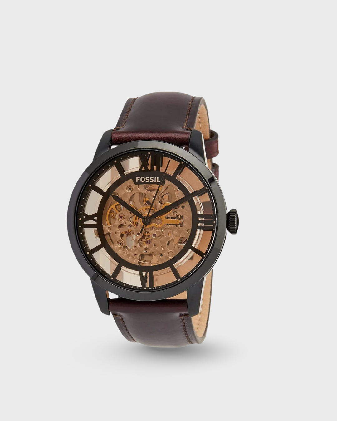 Discover Fossil watch for men, featuring a brown dial, a brown strap made of leather in a round case. Built with mineral glass and stainless steel body to balance clarity and durability. Dimensions include 44 mm dial size, 22 mm strap width, 12 mm profile for comfortable wear. Key features: automatic movement, analog display, 5 atm water resistance. A secure buckle clasp ensures a dependable fit.