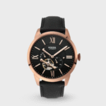 Discover Fossil watch for men, featuring a black dial, a black strap made of leather in a round case. Built with mineral glass and stainless steel body to balance clarity and durability. Dimensions include 44 mm dial size, 22 mm strap width, 11 mm profile for comfortable wear. Key features: automatic movement, multi-function display, 5 atm water resistance. A secure tang buckle ensures a dependable fit.