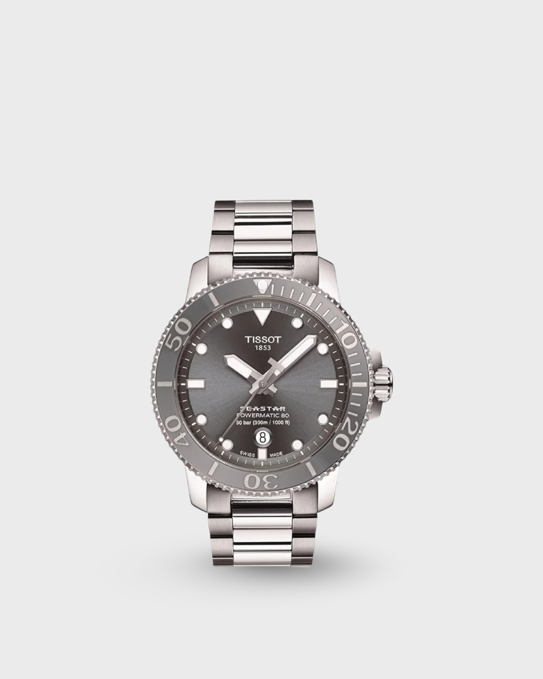 The Tissot Seastar 1000 merges style and performance without compromising either. With its water resistance up to 30 bar (300 m/1000 ft), screw-down crown and case back, it is the ultimate watersport watch, now combined with the energy of the Powermatic 80 movement offering up to 80 hours of power reserve when most of automatic movements boasts around 40 hours