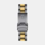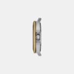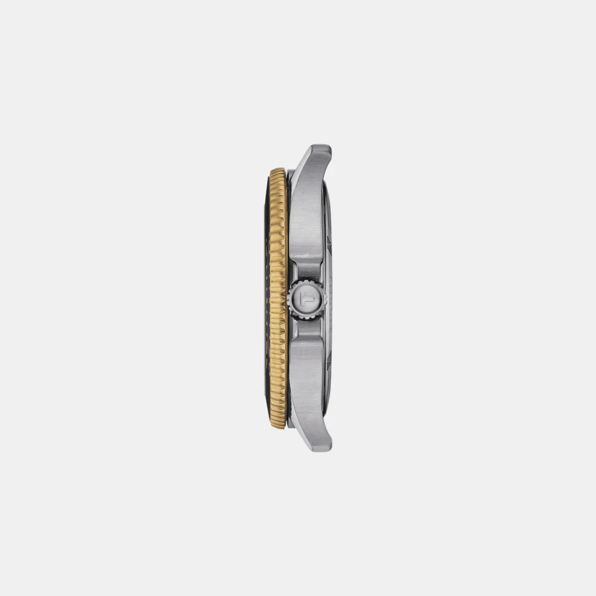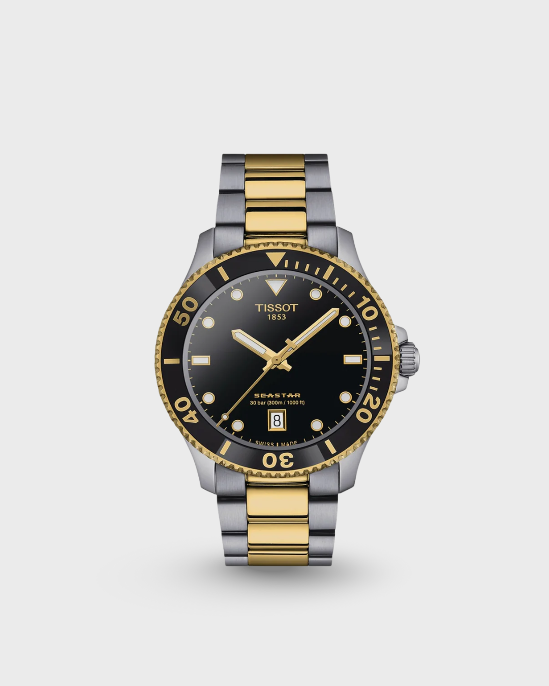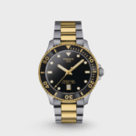 This Tissot Seastar 1000 40mm model features a bicolor bezel, black with yellow gold PVD coating all around the edge. The bicolor bracelet made of 316L stainless steel also has a yellow gold-colored PVD coating and is equipped with a quick-release system.