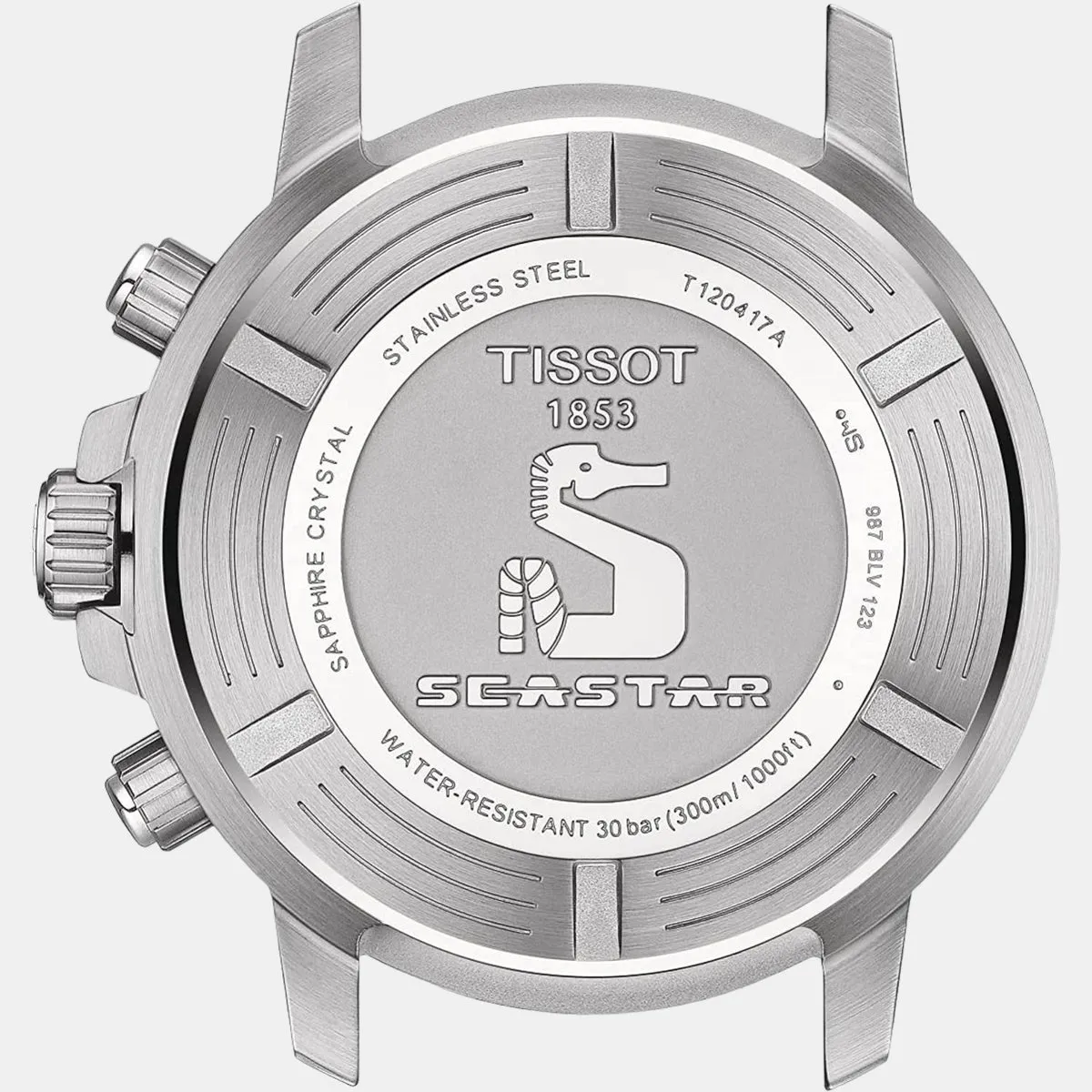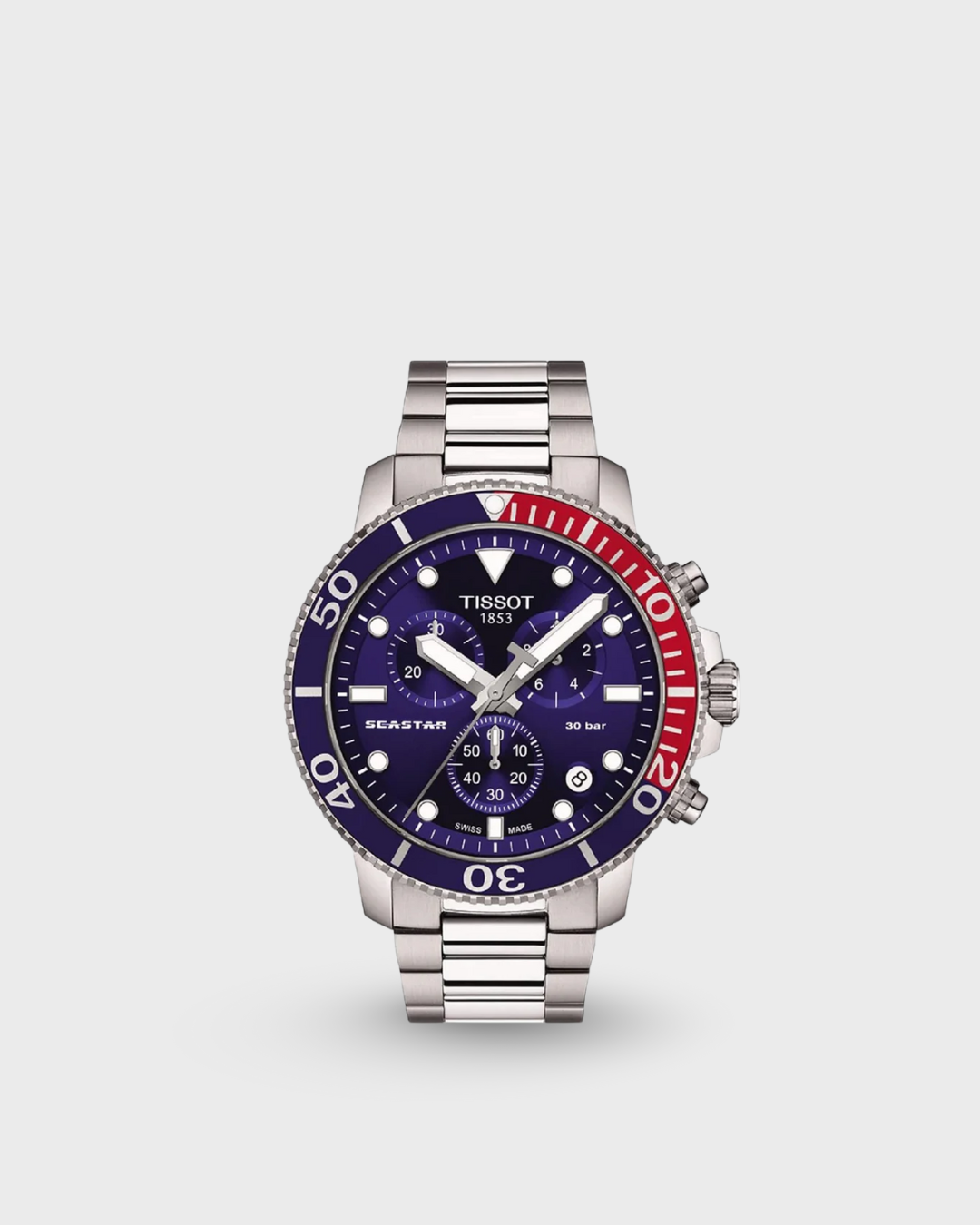 The Tissot Seastar 1000 Chronograph is the instinctive choice for water sports lovers. With its impressive water-resistance up to a pressure of 30 bar (300 m/1000 ft), screw-down crown and case back, as well as its unidirectional steel bezel with aluminium ring and highly luminescent material for excellent readability in the dark. Combined with the energy of a Swiss-made quartz movement.