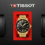 This version of the Tissot Supersport Chrono features a Swiss Made quartz movement and a 316L stainless steel case with yellow gold PVD coating. The black dial with date display is contrasted by yellow gold hands and hour markers. The 316L stainless steel bracelet, also coated with yellow gold PVD, features a quick release system. It’s easy to switch your strap and change styles.