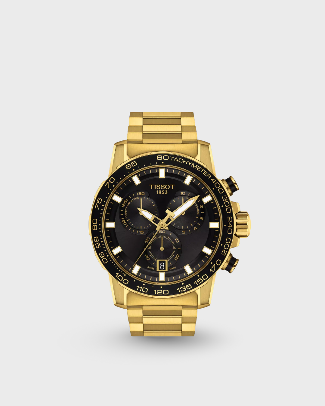 Massive SuperLuminova®-coated indexes offer impressive legibility in the dark. All Tissot Supersport Chrono models feature a solid 316L stainless steel case and scratch-resistant sapphire crystal, and are water-resistant up to a pressure of 10 bar (100 m).